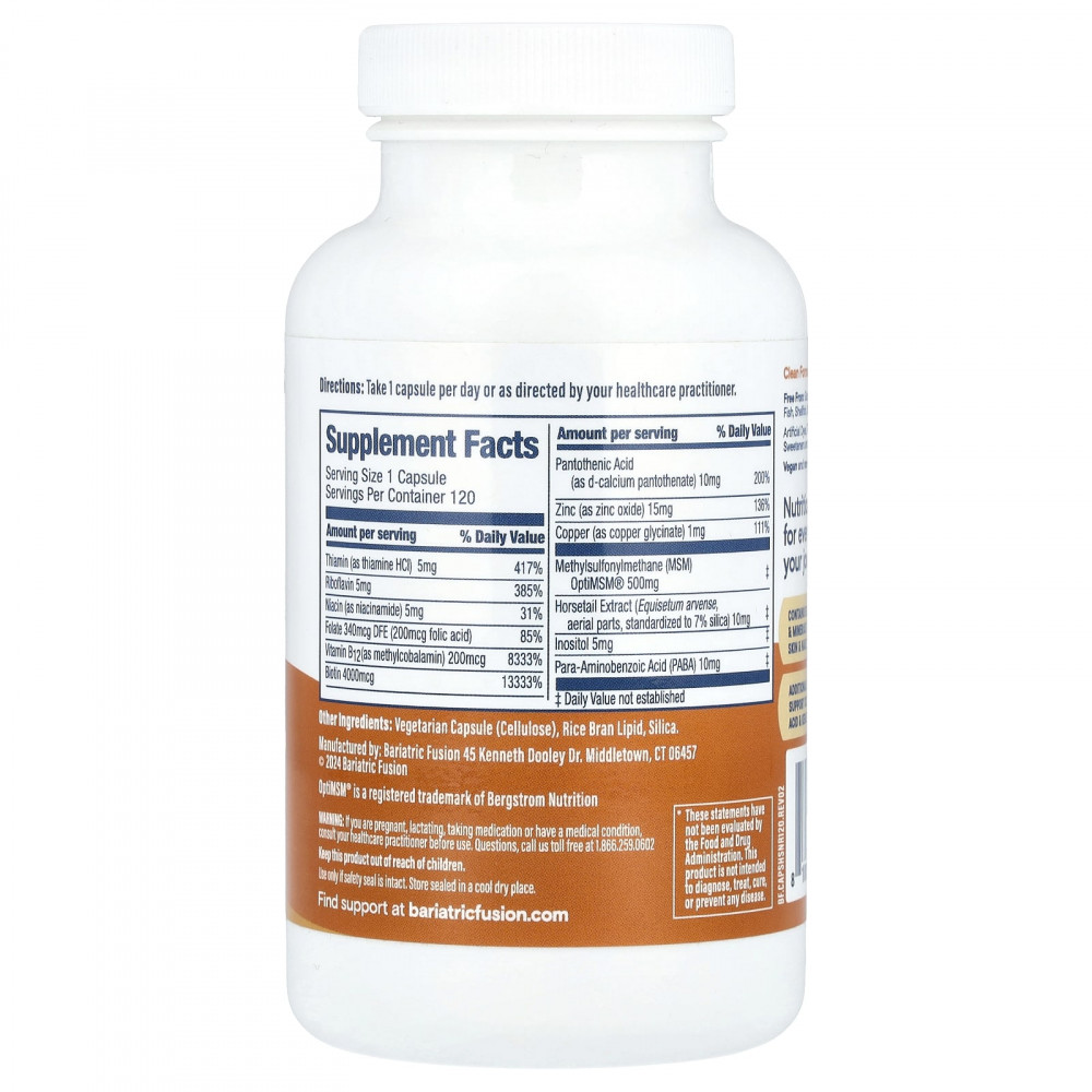 Средство для омоложения волос, кожи и ногтей Bariatric Fusion содержит ключевые питательные вещества для поддержания здоровья волос, кожи и ногтей, такие как коллаген. Он также содержит МСМ (метилсульфонилметан), диоксид кремния из экстракта хвоща и ПАБК для поддержки метаболизма важных компонентов волос, кожи и ногтей, включая коллаген, гиалуроновую кислоту и кератин.