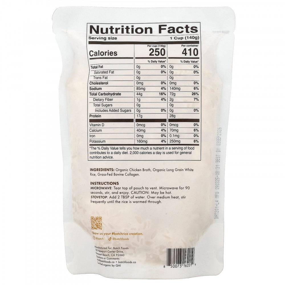 Эта смесь, изготовленная из всего трёх ингредиентов премиального качества - органического длиннозернового белого риса, органического куриного бульона и говяжьего коллагена от животных травяного откорма, - прекрасное дополнение к любимому блюду или в качестве гарнира.