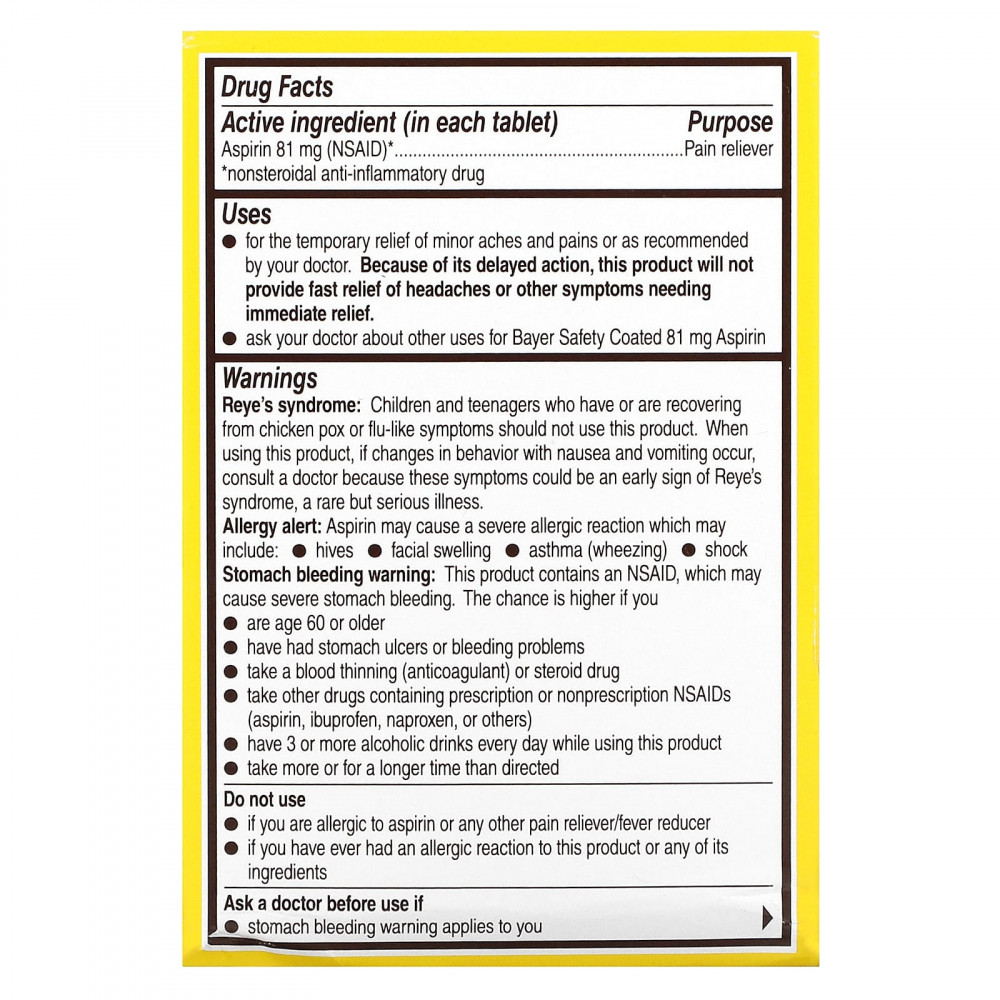 Назначение. Для временного облегчения незначительных болей или в соответствии с рекомендациями врача. Из-за своего замедленного действия этот продукт не обеспечивает быстрого облегчения головной боли или других симптомов, требующих немедленного облегчения. Узнайте у врача о других способах применения аспирина 81 мг с защитным покрытием Bayer