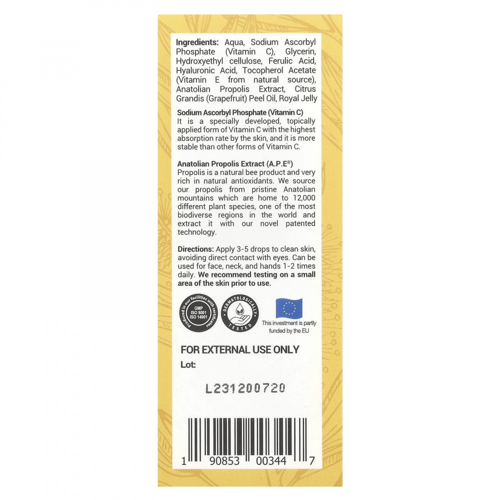 Вода, аскорбил фосфат натрия (витамин С), глицерин, гидроксиэтилцеллюлоза, феруловая кислота, гиалуроновая кислота, токоферола ацетат (витамин Е из натурального источника), экстракт анатолийского прополиса, масло из цедры грейпфрута (Citrus grandis), маточное молочко.