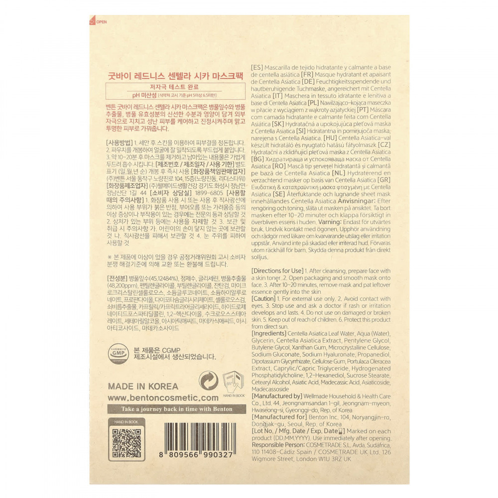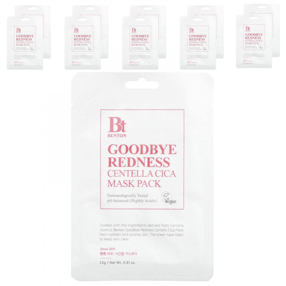 Маска Benton Goodbye Redness Centella Cica, пропитанная ингредиентами, полученными из готу колы (Centella asiatica), увлажняет и успокаивает кожу. Тканевая маска помогает сохранять кожу чистой.