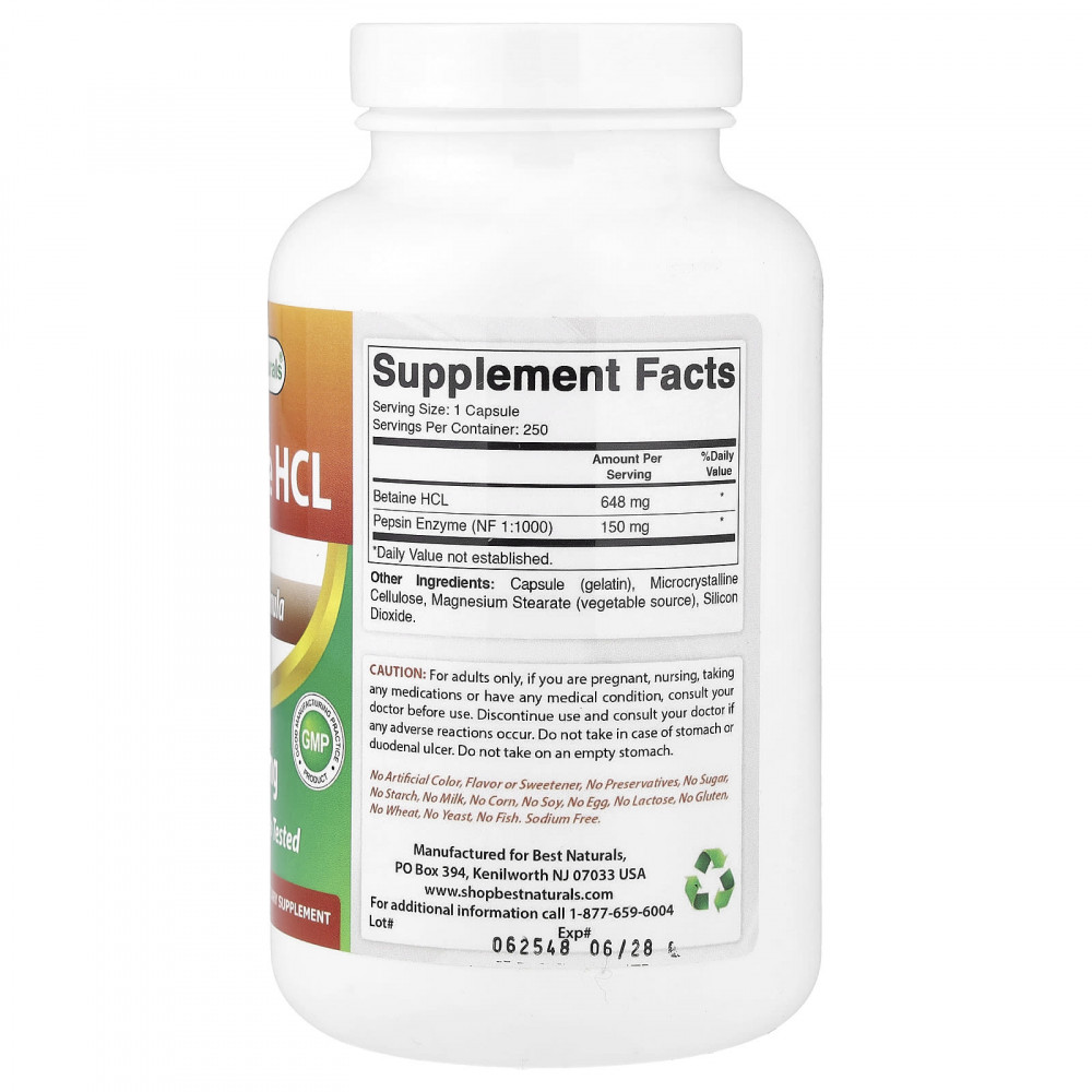 В желудке соляная кислота превращает пепсиноген в пепсин - фермент, расщепляющий белок. Пепсин расщепляет белки на более мелкие, более легко усваиваемые вещества. С возрастом секреция соляной кислоты может снижаться, что приводит к снижению уровня пепсина. Без надлежащего уровня пепсина организму сложно переваривать пищу. Гидрохлорид бетаина используется в качестве дополнительного источника соляной кислоты, которая может использоваться желудком для выработки пепсина. Сочетание бетаина гидрохлорида и пепсина обеспечивает превосходное тонизирующее средство для желудка. Некоторые исследовательские публикации указывают на то, что бетаина гидрохлорид может обеспечивать перечисленные ниже преимущества.