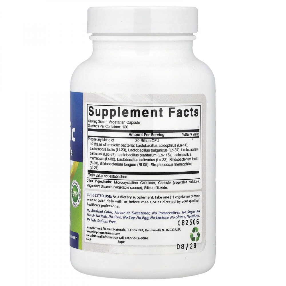 Пробиотики Best Naturals® (30 млрд КОЕ) - это сбалансированный спектр живых организмов, состоящий из кислотоустойчивых бактериальных штаммов, которые, как известно, являются естественными обитателями среды желудочно-кишечного тракта человека. Пробиотические бактерии очень важны для здорового пищеварения. Они поддерживают целостность оболочки кишечника, способствуют его здоровой перистальтике и участвуют в процессе детоксикации. Пробиотик (30 миллиардов КОЕ) стабилен при комнатной температуре. Некоторые исследовательские публикации указывают на то, что он может обеспечивать перечисленные ниже преимущества.