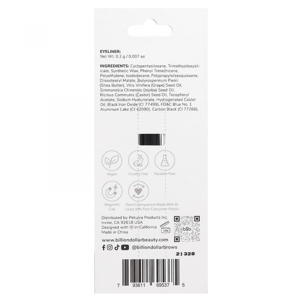 циклопентасилоксан, триметилсилоксисиликат, синтетический воск, фенилтриметикон, полиэтилен, изододекан, полипропилсилсесквиоксан, диизостеарил малат, масло ши (Butyrospermum parkii), масло из виноградных косточек (Vitis vinifera), масло из семян жожоба (Simmondsia chinensis), касторовое масло (Ricinus communis), токоферилацетат, гиалуронат натрия, гидрогенизированное касторовое масло, черный оксид железа (CI 77499), краситель синий FD&C 1 алюминиевый лак (CI 42090), жидкий уголь (CI 77266).