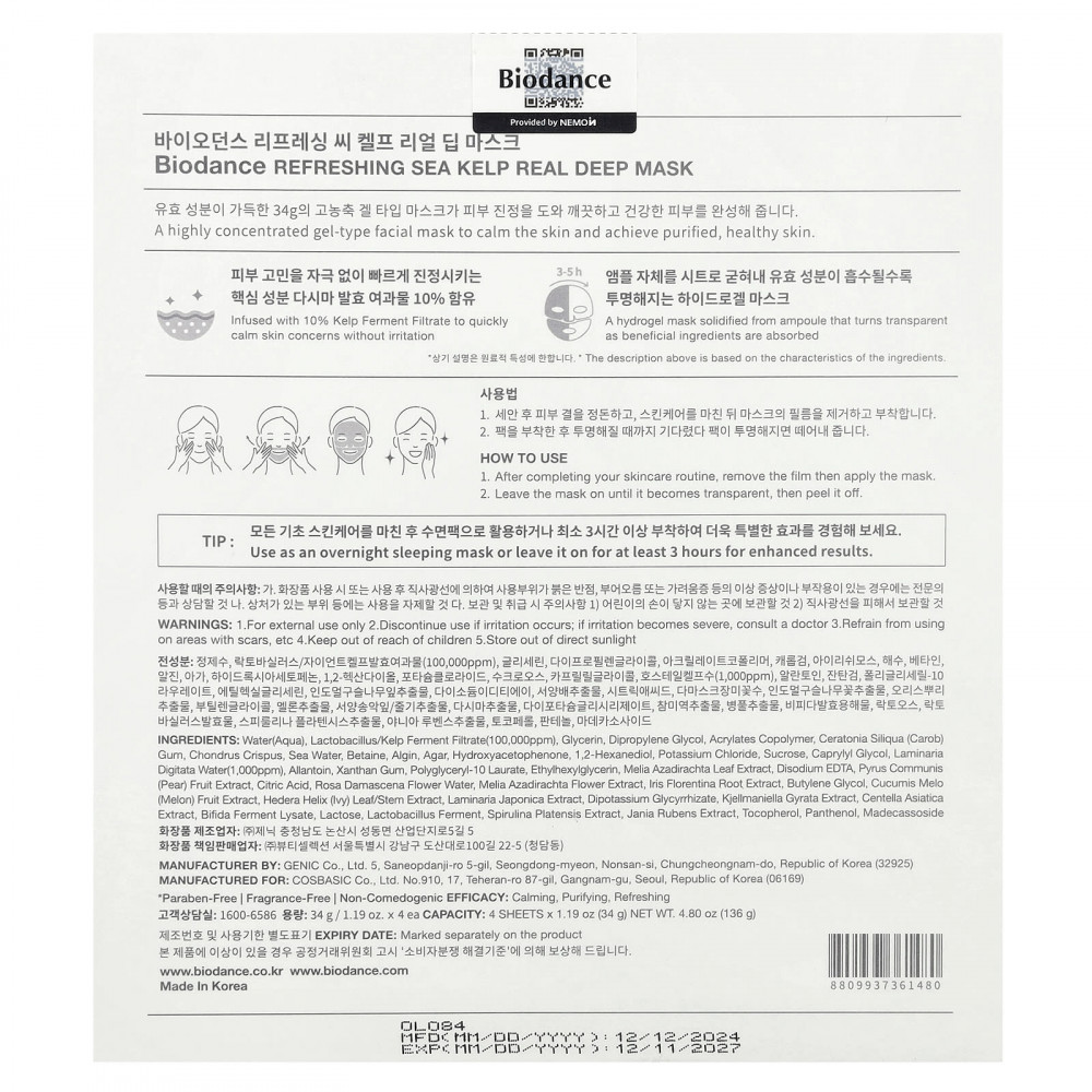 Вода (Aqua), фильтрат фермента лактобактерий / бурых водорослей (100 000 част. / млн), глицерин, дипропиленгликоль, сополимер акрилатов, камедь рожкового дерева (Ceratonia siliqua), Chondrus crispus, морская вода, бетаин, альгин, агар, гидроксиацетофенон, 1,2-гександиол, хлорид калия, сахароза, каприлилгликоль, вода ламинарии (Luminaria digitata) (1000 част. / млн), аллантоин, ксантановая камедь, полиглицерил-10 лаурат, этилгексилглицерин, экстракт листьев дерева ним (Melia azadirachta), двунатриевая ЭДТК, экстракт плодов груши (Pyrus communis), лимонная кислота, вода из цветков дамасской розы (Rosa damascena), экстракт цветков дерева ним (Melia azadirachta), экстракт корня ириса флорентийского, бутиленгликоль, экстракт плодов дыни (Cucumis melo), экстракт листьев / стеблей плюща (Hedera helix), экстракт ламинарии японской (Laminaria japonica), дикалия глицирризат, экстракт кьельманиеллы гирата, экстракт готу колы (Centella asiatica), лизат ферментов бифидобактерий, лактоза, фермент лактобактерий (Lactobacillus), экстракт спирулины (Spirulina platensis), экстракт жании рубенс (Jania rubens), токоферол, пантенол, мадекассосид.