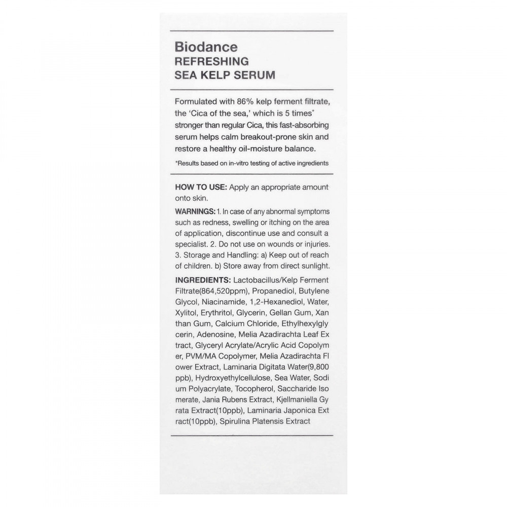 Ферментированный фильтрат лактобактерий/бурых водорослей (864 520 част./млн), пропандиол, бутиленгликоль, никотинамид, 1,2-гександиол, вода, ксилитол, эритритол, глицерин, геллановая камедь, ксантановая камедь, хлорид кальция, этилгексилглицерин, аденозин, экстракт листьев дерева ним (Melia azadirachta), сополимер глицерил акрилата/акриловой кислоты, ПВМ/МА сополимер, экстракт цветков нима (Melia azadirachta), вода из ламинарии пальчаторассеченной (Laminaria digitata) (9800 част./млрд), гидроксиэтилцеллюлоза, морская вода, полиакрилат натрия, токоферол, инвертный сахар, экстракт жании рубенс (Jania rubens), экстракт кьелманиеллы (Kjellmaniella gyrata) (10 част./млрд), экстракт ламинарии японской (Laminaria japonica) (10 част./млрд), экстракт спирулины (Spirulina platensis).