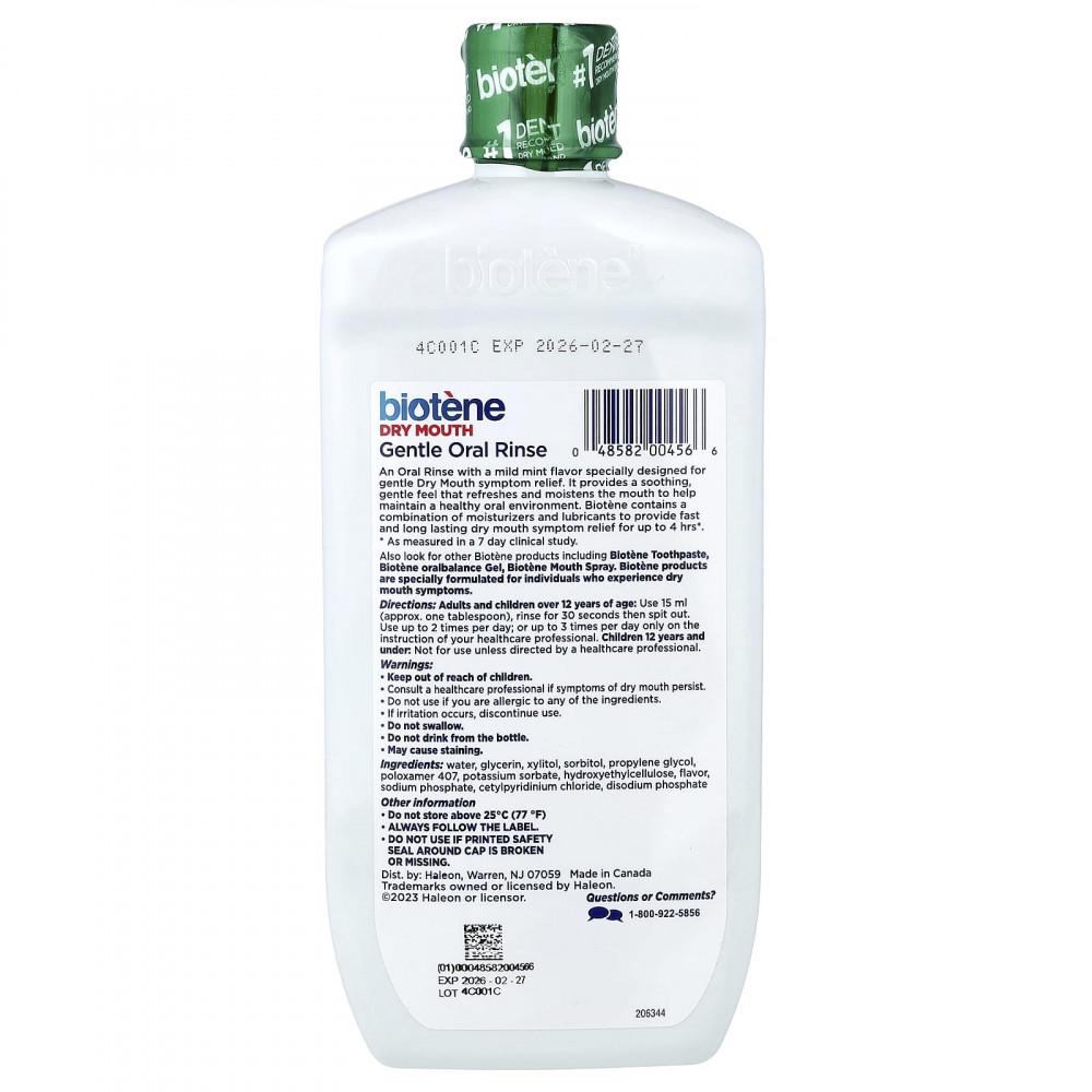 Средство для полоскания рта с мягким мятным вкусом, специально разработанное для облегчения симптомов сухости во рту. Средство успокаивает и мягко освежает и увлажняет полость рта, поддерживая здоровую среду в полости рта. Biotène содержит комбинацию увлажняющих и смазочных компонентов, которые обеспечивают быстрое и длительное облегчение симптомов сухости во рту до 4 часов*.