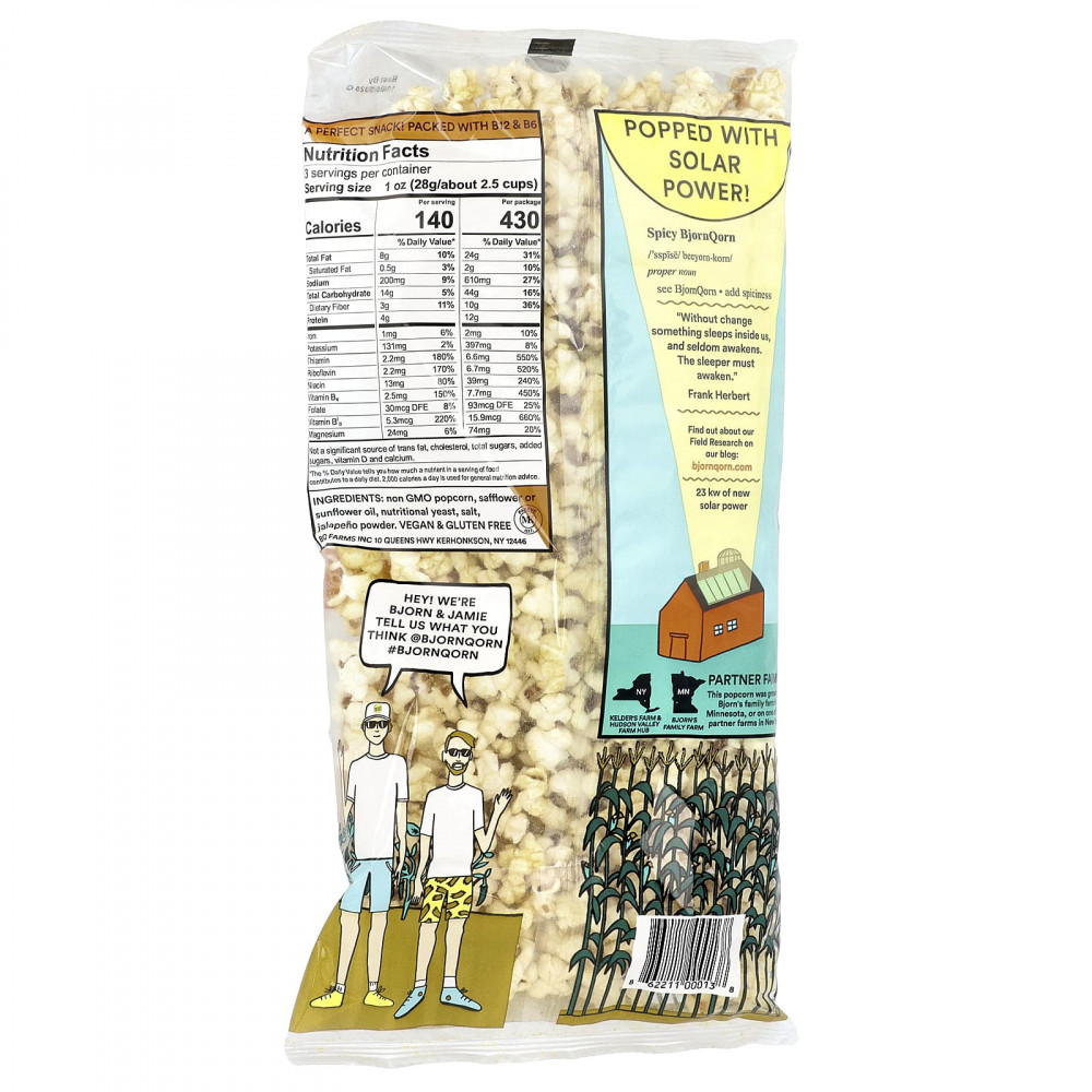 Попкорн без ГМО, сафлоровое или подсолнечное масло, пищевых дрожжей, соль, порошок халапеньо.