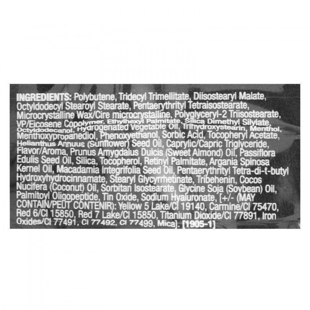 Полибутен, тридецил тримеллитат, диизостеарил малат, октилдодецил стеароил стеарат, пентаэритритил тетраизостеарат, микрокристаллический воск (Cera microcristallina), полиглицерил-2 триизостеарат, винилпирролидон/эйкозен сополимер, этилгексил пальмитат, диметил силилат диоксида кремния, октилдодеканол, гидрогенизированное растительное масло, тригидроксистеарин, ментол, ментоксипропандиол, феноксиэтанол, сорбиновая кислота, токоферилацетат, подсолнечное масло (Helianthus annuus), каприловый/каприновый триглицерид, ароматизатор, масло сладкого миндаля (Prunus amygdalus dulcis), масло из семян маракуйи (Passiflora edulis), диоксид кремния, токоферол, ретинилпальмитат, аргановое масло (Argania spinosa), масло макадамии (Macadamia integrifolia), пентаэритритил тетра-ди-трет-бутил гидроксигидроциннамат, стеарил глицирретинат, трибехенин, кокосовое масло (Cocos nucifera), сорбитан изостеарат, соевое масло (Glycine soja), пальмитоил олигопептид, оксид олова, гиалуронат натрия, [может содержать краситель желтый 5 лак (CI 19140), кармин (CI 75470), краситель красный 6 (CI 15850), краситель красный 7 лак (CI 15850), диоксид титана (CI 77891), оксиды железа (CI 77491, CI 77492, CI 77499), слюду].