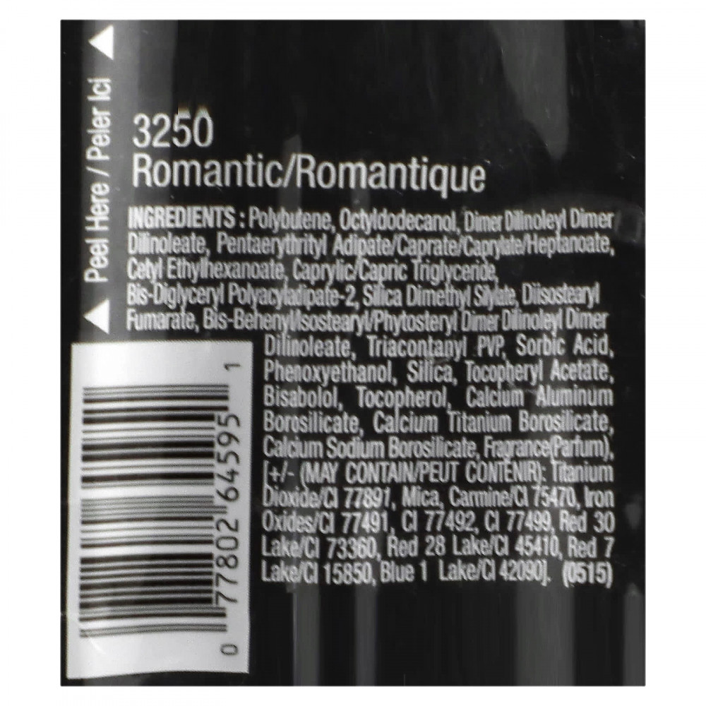 Полибутен, октилдодеканол, димер дилинолеил димер дилинолеат, пентаэритритил адипат/капрат/каприлат/гептаноат, цетилэтилгексаноат, каприловый/каприновый триглицерид, бис-диглицерил полиациладипат-2, диметил силилат диоксида кремния, диизостеарил фумарат, бисбегенилизостеар/фитостерил димер дилинолеил димер дилинолеат, триаконтанил ПВП, сорбиновая кислота, феноксиэтанол, диоксид кремния, токоферилацетат, бисаболол, токоферол, кальций алюминий боросиликат, боросиликат кальция и титана, кальций натрий боросиликат, отдушка парфюмерная), Может содержать Диоксид титана (CI 77891), слюда, Кармин (CI 75470), оксиды железа/CI 77491, CI 77492, CI 77499, Краситель красный 30 лак (CI 73360), Краситель красный 28 лак (CI 45410), краситель красный 7 Lake/CI 15850, краситель синий 1 лак (CI 42090). (0515)