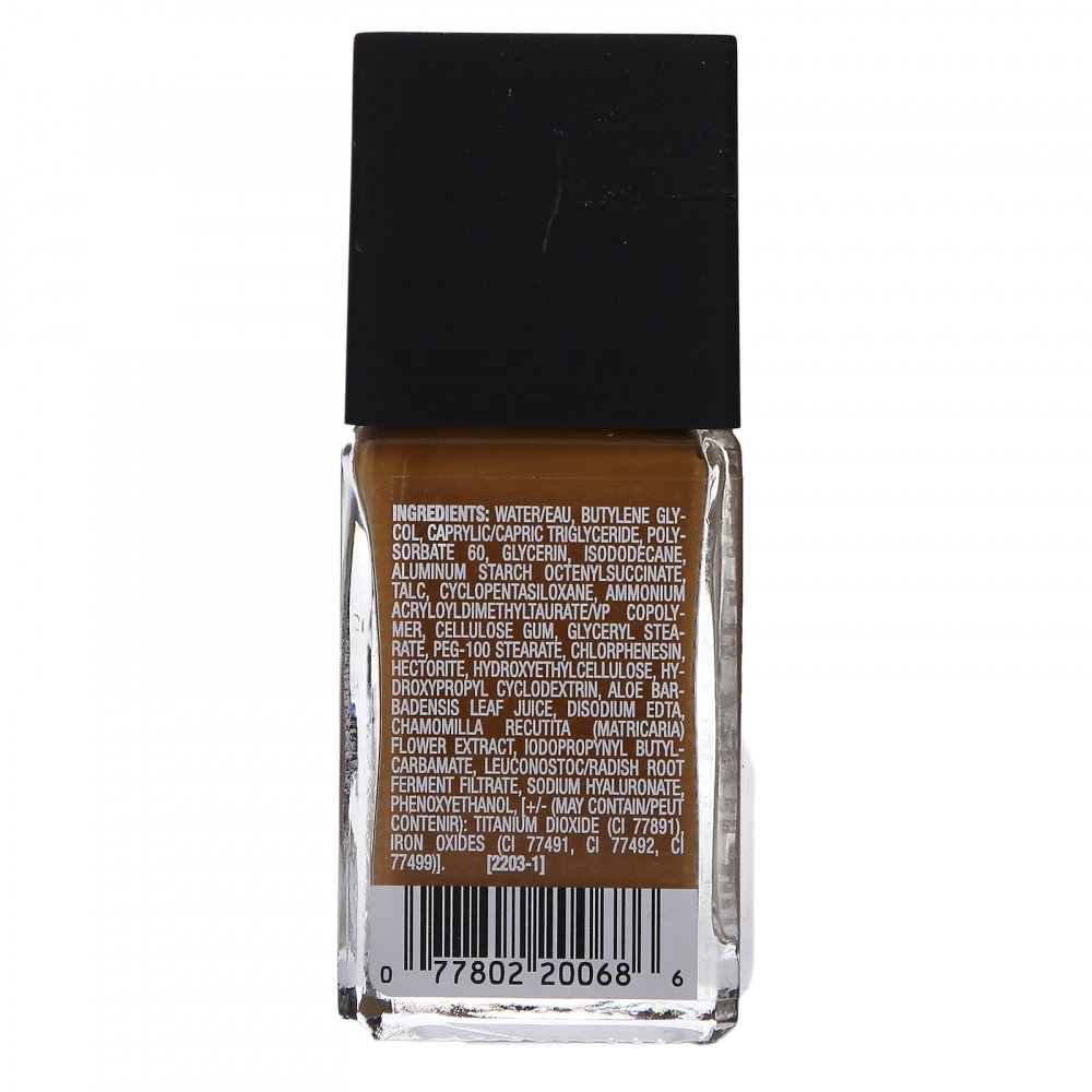 Вода, бутиленгликоль, каприловый/каприновый триглицерид, полисорбат 60, глицерин, изододекан, алюминий крахмал октенилсукцинат, тальк, циклопентасилоксан, аммоний акрилоилдиметилтаурат/ВП сополимер, целлюлозная камедь, глицерил стеарат, ПЭГ-100 стеарат, хлорфенезин, гекторит, гидроксиэтилцеллюлоза, гидроксипропил циклодекстрин, сок из листьев алоэ вера (Aloe barbadensis), двунатриевая ЭДТК, экстракт цветков ромашки (Chamomilla recutita), йодопропинил бутилкарбамат, лейконосток/ферментированный фильтрат корня редиса, гиалуронат натрия, феноксиэтанол, [может содержать: диоксид титана (CI 77891), оксиды железа (CI 77491, CI 77492, CI 77499)].