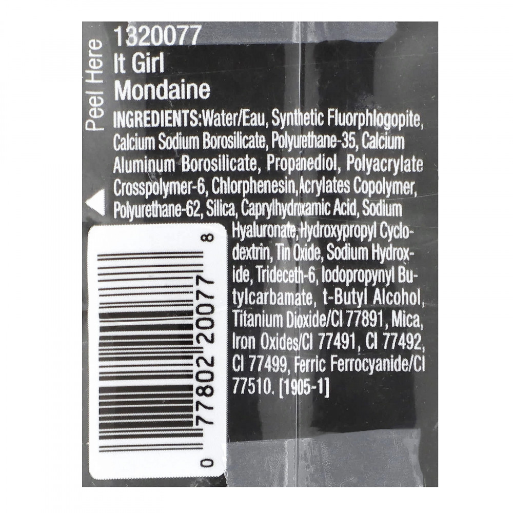 Вода, синтетический фторфлогопит, кальций натрий боросиликат, полиуретан-35, кальций алюминий боросиликат, пропандиол, полиакрилата кроссполимер-6, хлорфенезин, сополимер акрилатов, полиуретан-62, диоксид кремния, каприлгидроксаминовая кислота, гиалуронат натрия, гидроксипропил циклодекстрин, оксид олова, гидроксид натрия, тридецет-6, йодопропинил бутилкарбамат, т-бутиловый спирт, диоксид титана (CI 77891), слюда, оксиды железа (CI 77491, CI 77492, CI 77499), берлинскую лазурь (CI 77510).