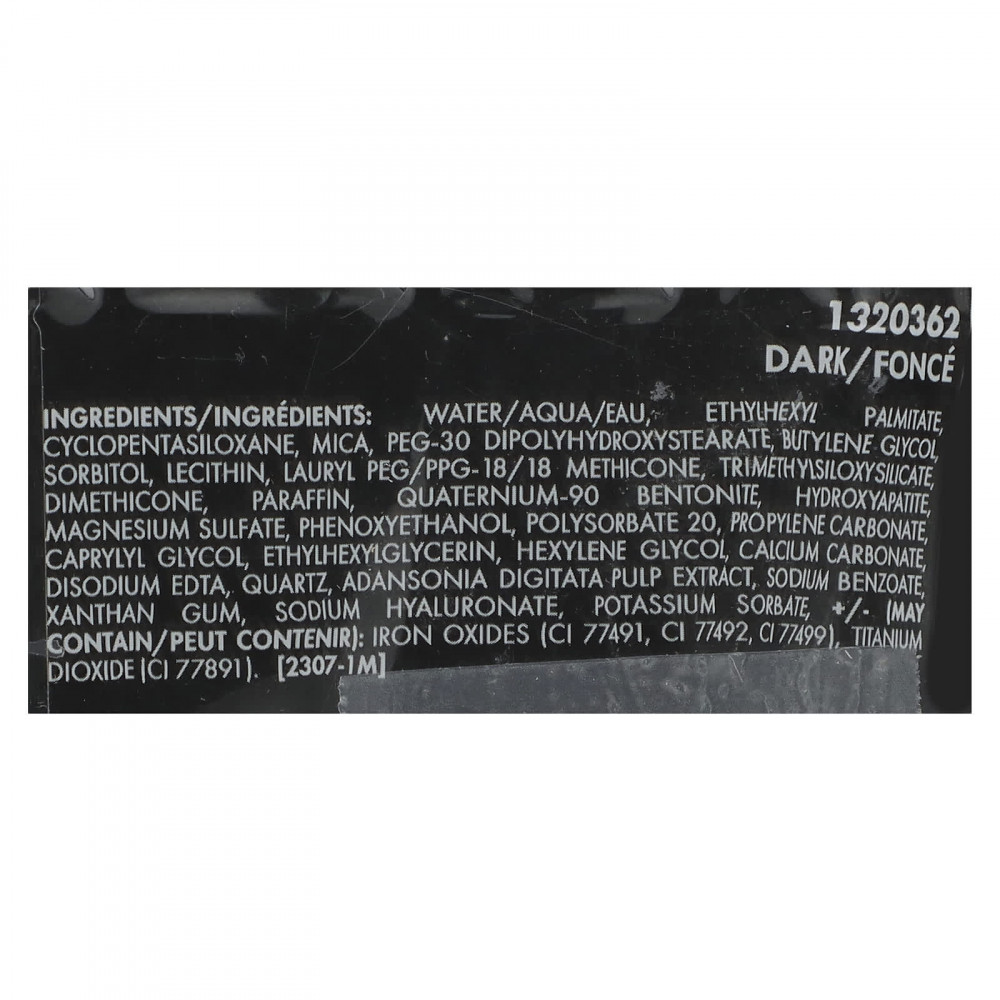 Вода, этилгексил циклопентасилоксан, слюда, ПЭГ-30 диполигидроксистеарат, бутиленгликоль пальмитат, сорбитол, лецитин, лаурил-ПЭГ / ППГ-18 / 18 метикон, триметилсилоксисиликат, диметикон, парафина, кватерниум-90 бентонит, гидроксиапатит, сульфат магния, феноксиэтанол, полисорбат 20, пропиленкарбонат, каприлилгликоль, этилгексилглицерин, гексиленгликоль, карбонат кальция, двунатриевая ЭДТК, кварц, экстракт мякоти баобаба (Adansonia digitata), бензоат натрия, ксантановая камедь, гиалуронат натрия, сорбат калия, (может содержать): оксиды железа (CI 77491, CI 77492, CI 77499), диоксид титана (CI 77891).