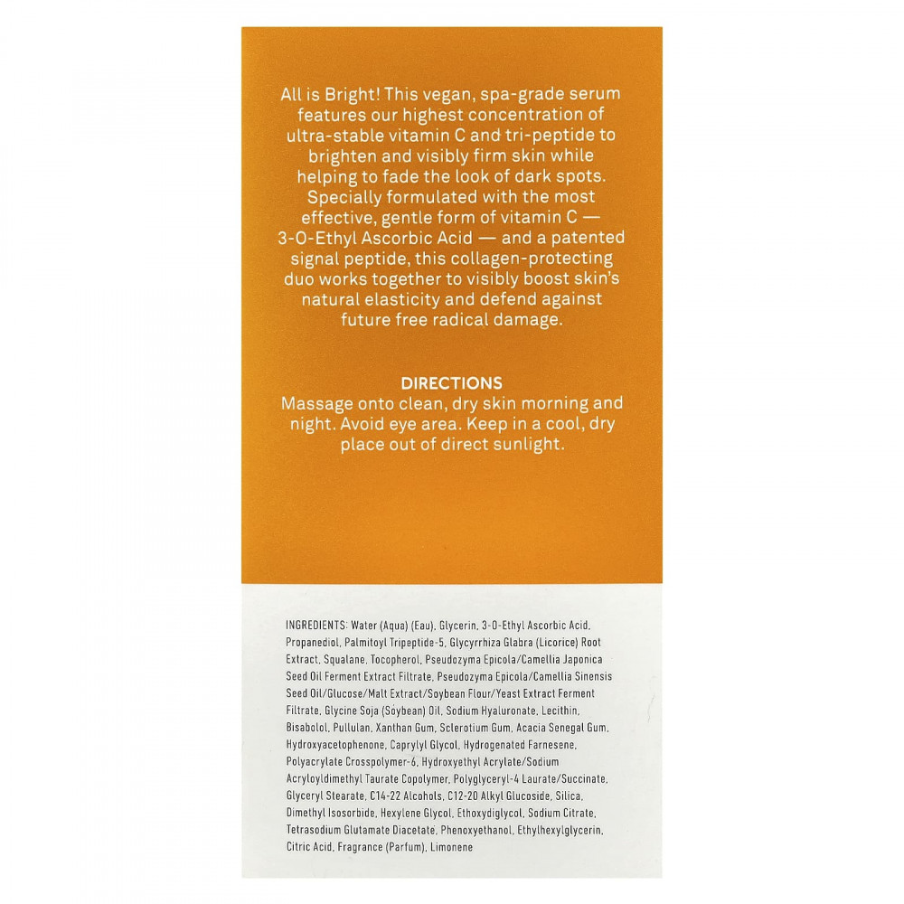 Все ярко! Эта веганская сыворотка спа-класса содержит самую высокую концентрацию сверхстабильного витамина С и трипептида, которые делают кожу более яркой и упругой, помогая избавиться от пигментных пятен. Этот дуэт, защищающий кожу от коллагена, специально разработан с использованием наиболее эффективной и мягкой формы витамина C 3-0-этил аскорбиновой кислоты и запатентованного сигнального пептида, заметно повышая естественную эластичность кожи и защищая ее от повреждения свободными радикалами в будущем.