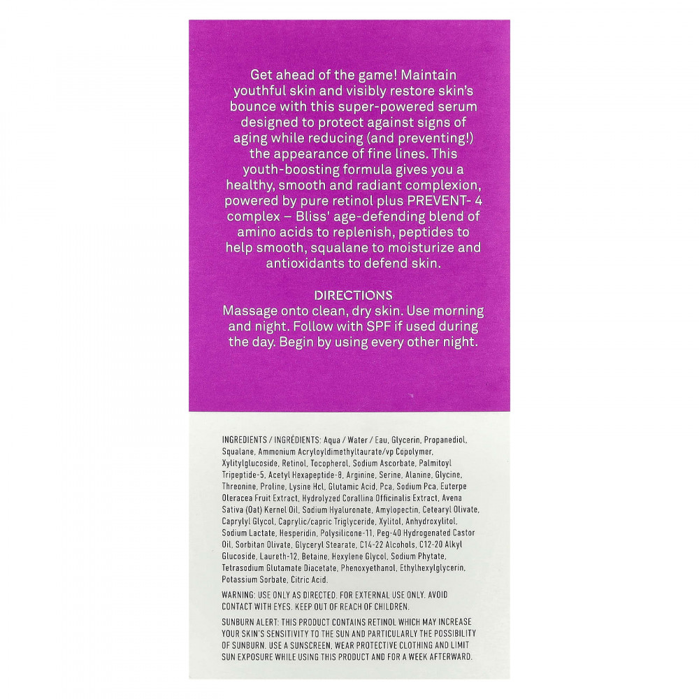 Сделайте шаг вперед! Сохраните молодость кожи и заметно восстановите упругость кожи с помощью этой сверхмощной сыворотки, разработанной для защиты от признаков старения, уменьшая (и предотвращая!) Появление мелких морщин. Эта омолаживающая формула обеспечивает здоровый, гладкий и сияющий цвет лица благодаря чистому ретинолу и комплексу PREVENT-4 - омолаживающей смеси аминокислот Bliss для восстановления, пептидам для разглаживания, сквалану для увлажнения и антиоксидантам для защиты кожи .
