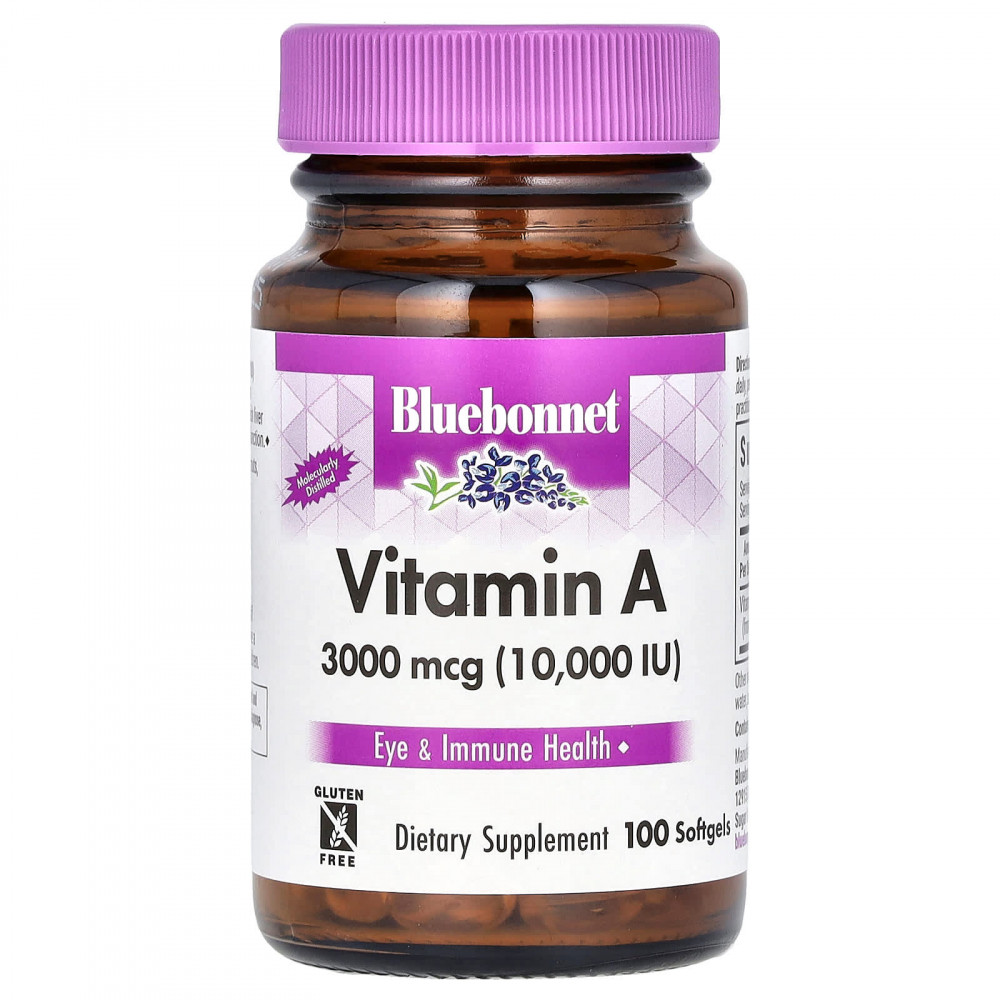 Капсулы с витамином A 3000 мкг (10 000 МЕ) от Bluebonnet содержат витамин A из дистиллированного на молекулярном уровне жира из глубоководной холодноводной рыбьей печени, который помогает поддерживать здоровье глаз и иммунную функцию.