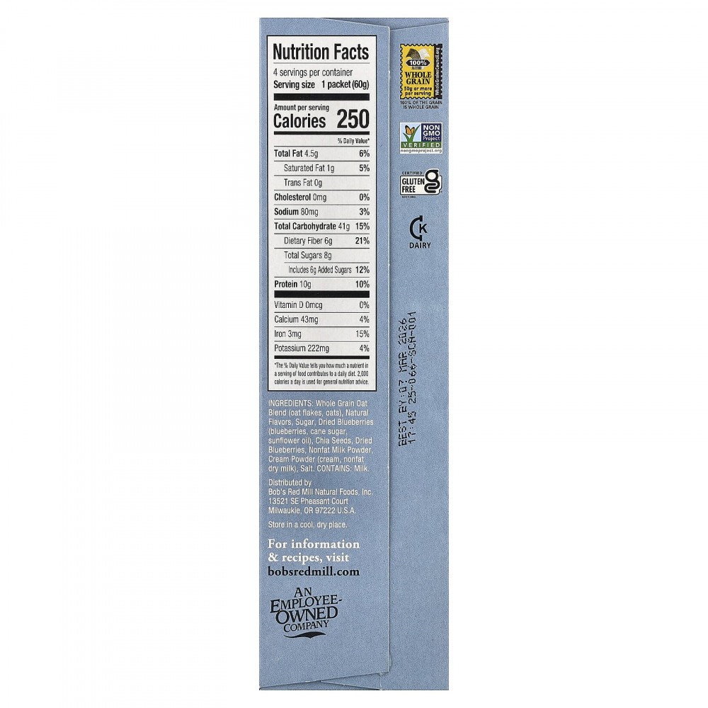 Цельнозерновая овсяная смесь (овсяные хлопья, овес), натуральные ароматизаторы, сахар, сушеная голубика, тростниковый сахар, подсолнечное масло), семена чиа, сушенная голубика, сухое обезжиренное молоко, сухие сливки (сливки, обезжиренное сухое молоко), соль.