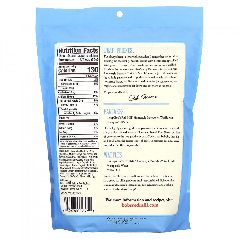 1 1/4 стакана смеси для блинов и вафли Bob's Red Mill® Homestyle 2/3 стакана холодной воды 2 столовые ложки масла Разогрейте вафельницу на среднем огне не менее 10 минут. В миске перемешайте все ингредиенты, пока они не смешаются. Следуйте инструкциям производителя вафельницы касательно дозирования теста и выпекания вафель. Получится примерно 3 вафли.