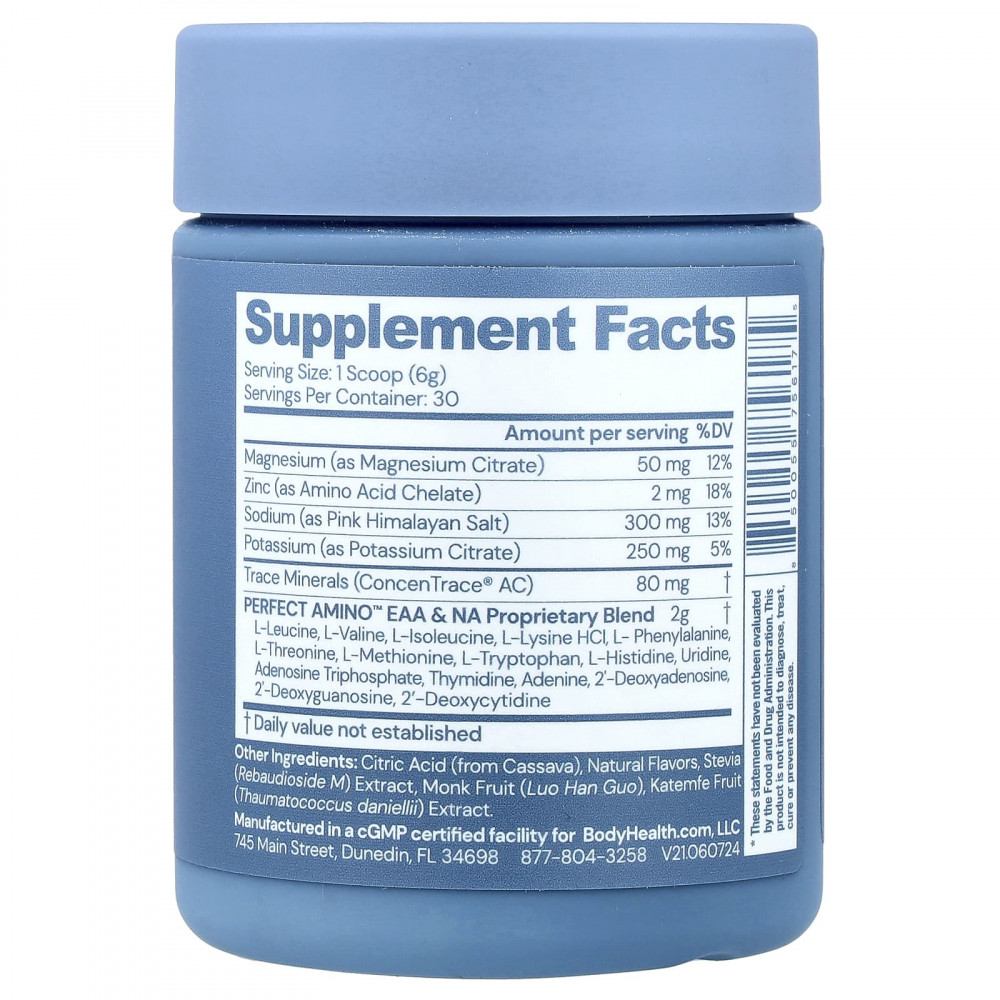 Точный состав электролитов PERFECT AMINO ™ содержит смесь ключевых минералов и электролитов, включая магний, цинк, натрий и калий, а также 68 дополнительных микроэлементов и аминокислот в ионной форме. Он предназначен для восстановления того, что было утрачено в результате физической активности, и способствует оптимальному увлажнению и быстрому восстановлению.