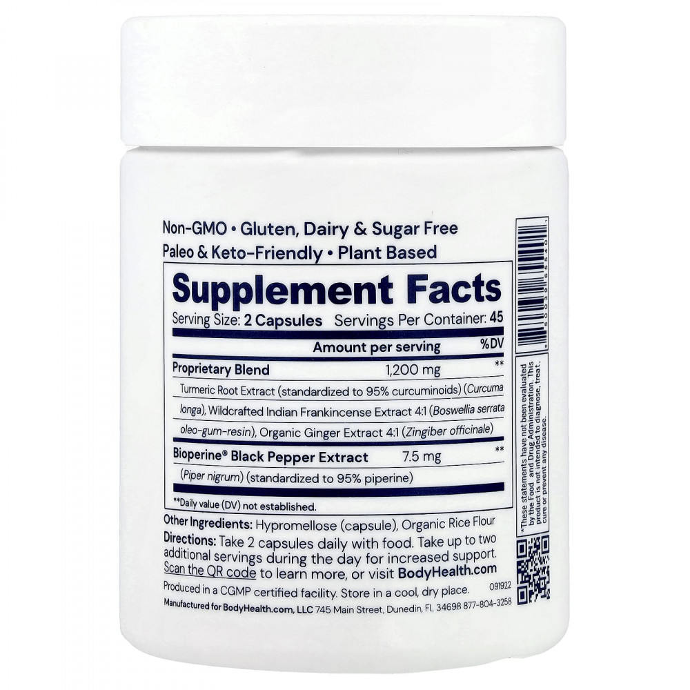 | Запатентованная смесь Экстракт корня куркумы (стандартизированный до 95% куркуминоидов) (Curcuma longa), экстракт дикорастущего индийского ладана 4: 1 (Boswellia serrata олео-камедь-смола), экстракт органического имбиря 4: 1 (Zingiber officinale) | 1200 мг | ** |