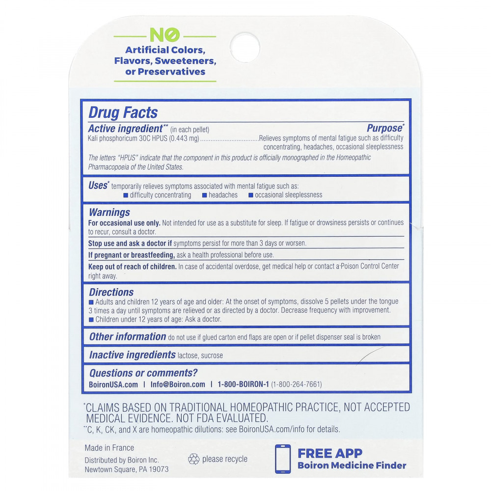 | Kali phosphoricum 30C HPUS | Снимает такие симптомы, как головные боли, бессонница, усталость и трудности с концентрацией, связанные с умственной усталостью |