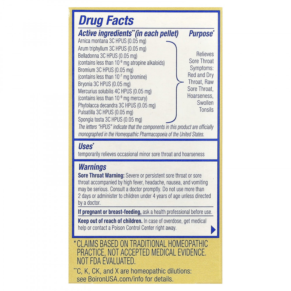 | Арника (Arnica montana) 3C HPUS (0,05 мг) Арум (Arum triphyllum) 3C HPUS (0,05 мг) Белладонна 3C HPUS (0,05 мг) (содержит менее 10- 9 мг атропиновых алкалоидов) Бром 3C HPUS (0,05 мг) (содержит менее 10- 7 мг брома) бриония 3C HPUS (0,05 мг) Mercurius solubilis 4C HPUS (0,05 мг) (содержит менее 10- 9 мг ртути) Phytolacca decandra 3C HPUS (0,05 мг) Сон-трава 3C HPUS (0,05 мг) Spongia tosta 3C HPUS (0,05 мг) | Снимает боль в горле Покраснение и сухость в горле, боль в горле, охриплость голоса, опухшие миндалины |