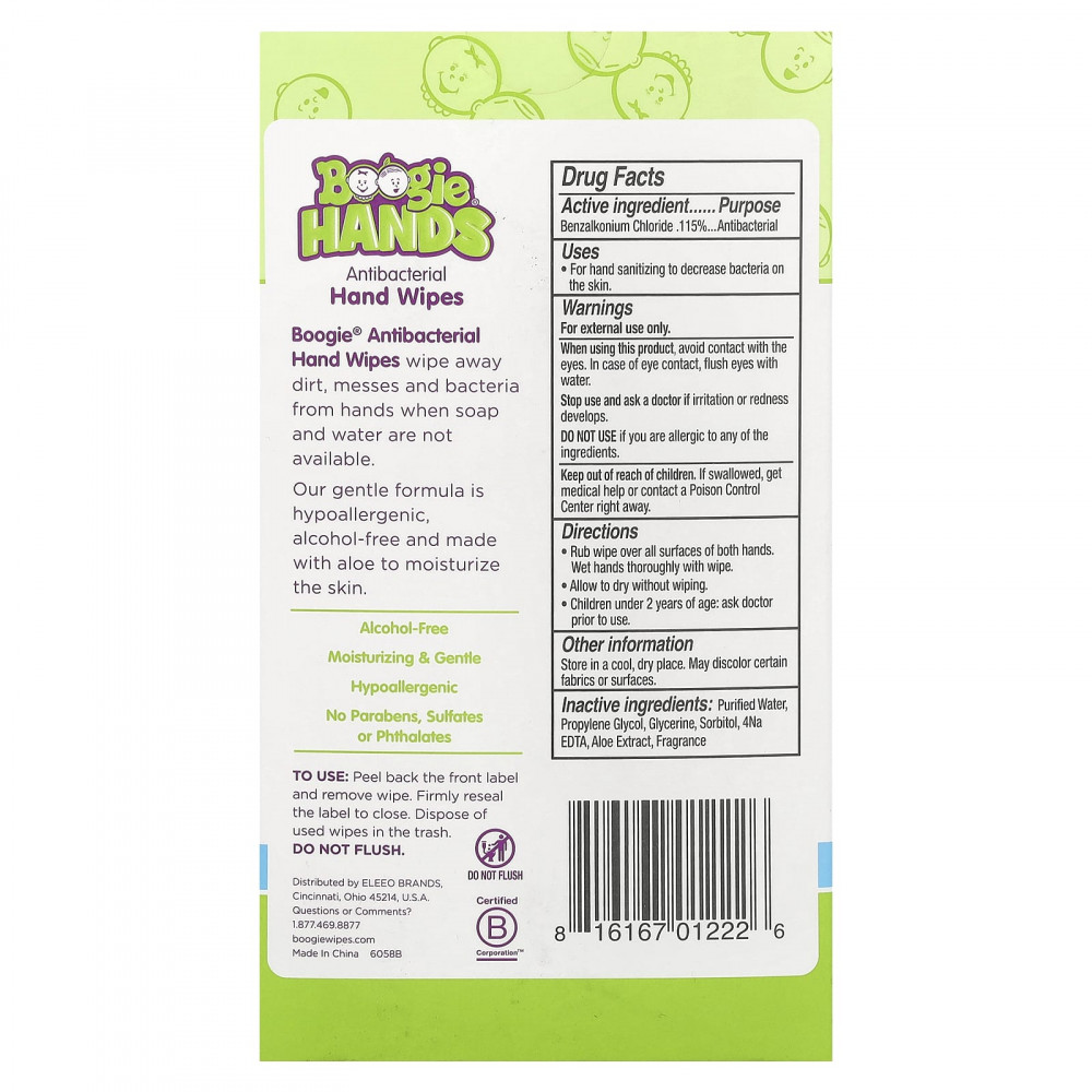 Boogie® Antibacterial Hand Wipes wipe away dirt, messes and bacteria from hands when soap and water are not available. Our gentle formula is hypoallergenic, alcohol-free and made with aloe to moisturize the skin.