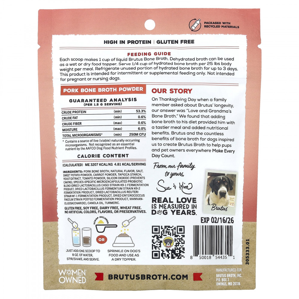 Каждая мерная ложка подходит для приготовления 1 стакана жидкого бульона из костей Brutus. Обезвоженный бульон можно использовать в качестве добавки для влажного или сухого корма. Давайте 1/4 стакана гидратированного костного бульона на 9 кг (25 фунтов) веса тела за один прием пищи. Храните неиспользованную порцию гидратированного костного бульона в холодильнике до 3 дней. Данный продукт предназначен только для периодического применения в качестве пищевой добавки или дополнительного питания. Не предназначен для беременных и кормящих собак.