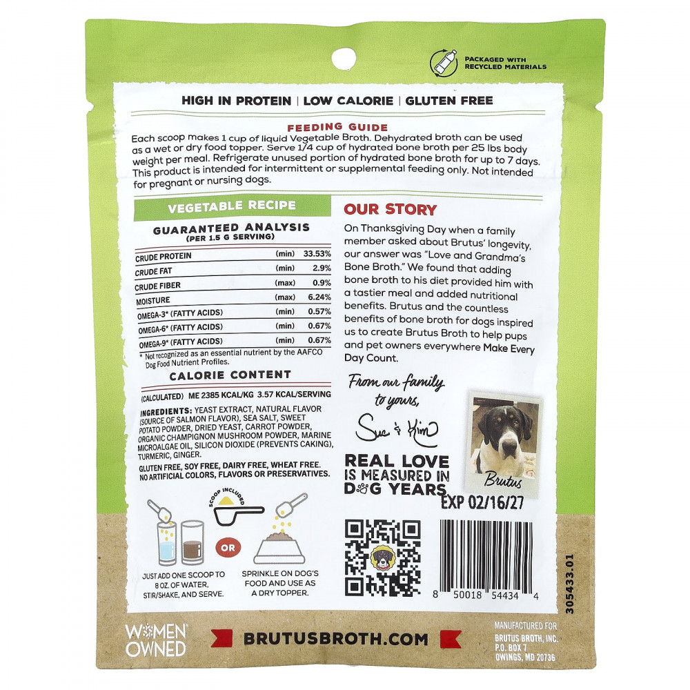 Каждая мерная ложка подходит для приготовления 1 стакана жидкого овощного бульона. Обезвоженный бульон можно использовать в качестве добавки для влажного или сухого корма. Давайте 1/4 стакана гидратированного костного бульона на 9 кг (25 фунтов) веса тела за один прием пищи. Храните неиспользованную порцию гидратированного костного бульона в холодильнике до 7 дней. Данный продукт предназначен только для периодического применения в качестве пищевой добавки или дополнительного питания. Не предназначен для беременных и кормящих собак.