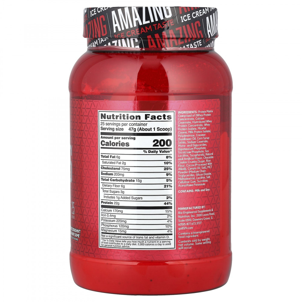 Белковая матрица (концентрат сывороточного протеина, изолят сывороточного протеина, казеинат кальция, мицеллярный казеин, изолят молочного протеина, яичный альбумин, пептиды глютамина), полидекстроза, забеливатель из подсолнечника (подсолнечное масло, сухая кукурузная патока, казеинат натрия, моно- и диглицериды, дикалийфосфат, трикальцийфосфат, соевый лецитин, токоферолы), полидекстроза, натуральные и искусственные ароматизаторы, крошки печенья (обогащенная мука [пшеничная мука, ниацин, восстановленное железо, мононитрат тиамина, рибофлавин, фолиевая кислота], сахара, пальмовое масло и масло пальмовых ядер, какао [обработано щелочью], кукурузный сироп с высоким содержанием фруктозы, кукурузная мука, соль, декстроза, бикарбонат натрия, соевый лецитин), порошок со среднецепочечными триглицеридами (среднецепочечные триглицериды, обезжиренное сухое молоко, динатрий фосфат, диоксид кремния), лецитин, соль, целлюлозная камедь, сукралоза, ацесульфам калия, папаин, бромелаин.