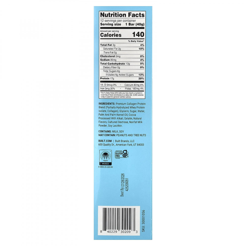 Протеиновая смесь коллагена премиального качества (частично гидролизованный изолят сывороточного протеина, коллагеном), глицерин, сахар, вода, пальмовое и пальмоядровое масло, обработанное щелочью какао, желатина, натуральные ароматизаторы, выращенная декстроза, сухое обезжиренное молоко, лецитин из сои.