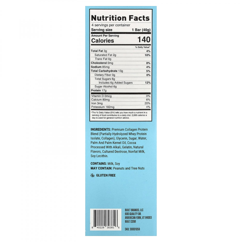 Протеиновая смесь коллагена премиального качества (частично гидролизованный изолят сывороточного протеина, коллагеном), глицерин, сахар, вода, пальмовое и пальмоядровое масло, обработанное щелочью какао, желатина, натуральные ароматизаторы, выращенная декстроза, обезжиренное молоко, лецитин из сои.