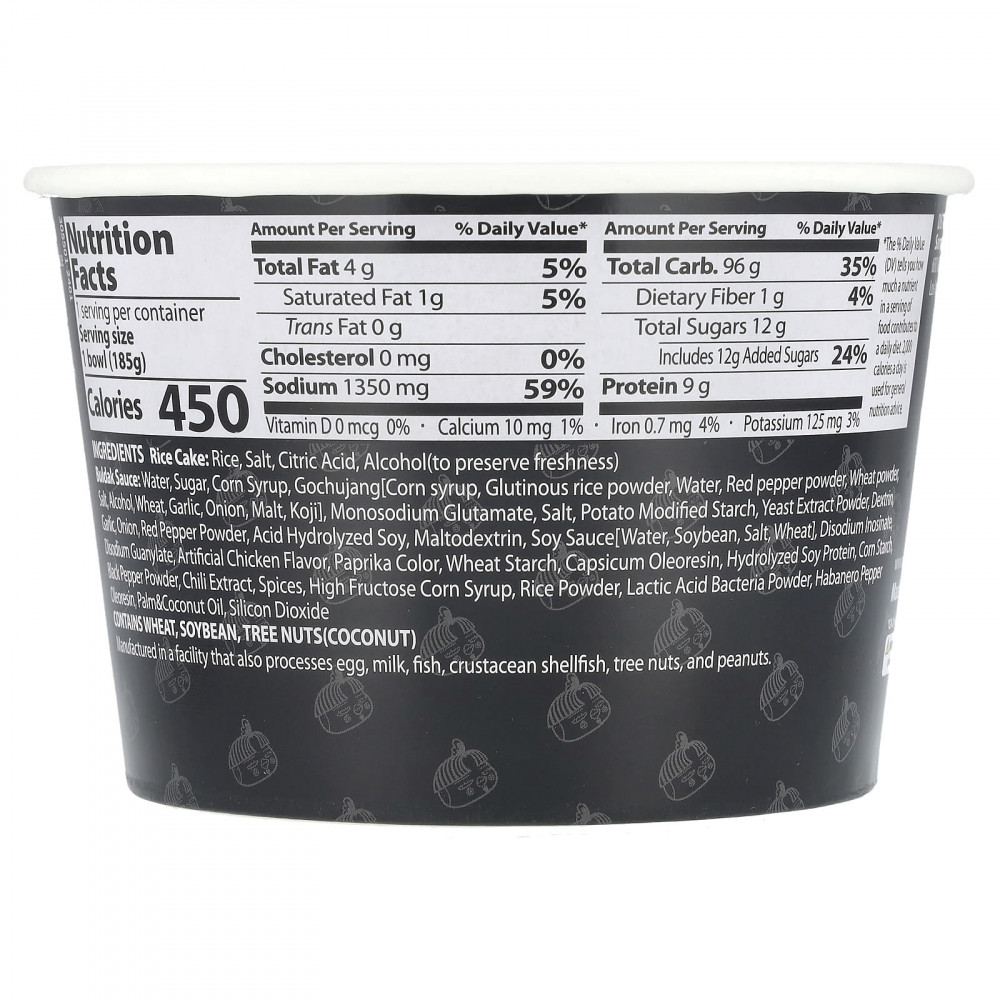 Рисовый торт: Рис, соль, лимонная кислота, спирт (для сохранения свежести). Булдакский соус: Вода, сахара, кукурузный сироп, Gochujang [кукурузный сироп, клейкая рисовая пудра, вода, порошок из красного перца, пшеничный порошок, соль, спирт, пшеница, чеснок, лук, солод, кодзи], глутамат натрия, соль, картофельный модифицированный крахмал, порошок из экстракта дрожжей, декстрин, чеснок, лук, порошок из красного перца, кислотно-гидролизованная соя, мальтодекстрин, соевый соус [вода, соя, соль, пшеница], динатрия инозинат, двунатриевый гуанилат, искусственный куриный ароматизатор, паприка, пшеничный крахмал, стручковый перец, гидролизованный белок из сои, кукурузный крахмал, порошок из перца, экстракт чили, специи, кукурузного сиропа с высоким содержанием фруктозы, рисовый порошок, порошок молочнокислых бактерий, перец хабанеро, олеорезин, пальма & amp; кокосовое масло, диоксид кремния.