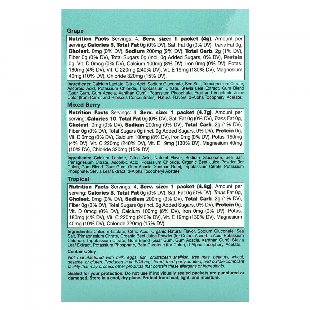 Лактат кальция, лимонная кислота, органический натуральный ароматизатор, глюконат натрия, морская соль, цитрат тримагния, порошок из сока органической свеклы (краситель), аскорбиновая кислота, хлорид калия, цитрат калия 3-замещенный, смесь камеди (гуаровая камедь, аравийская камедь, ксантановая камедь), экстракт листьев стевии, фосфат калия, Бета-каротин (краситель), d-альфа токоферилацетат.