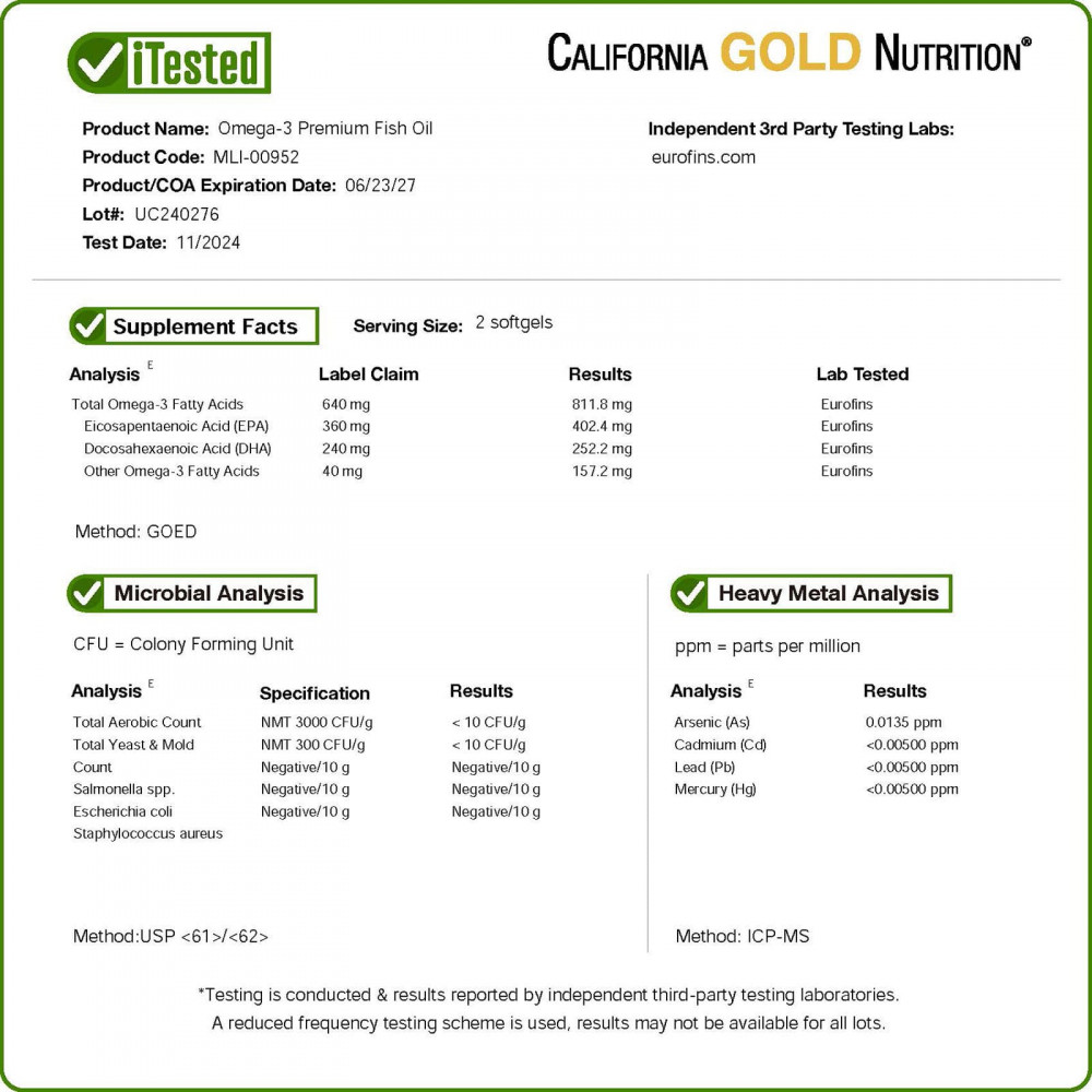 California Gold Nutrition Рыбий жир омега-3 премиального качества продукт молекулярной дистилляции содержит 180 мг ЭПК и 120 мг ДГК в одной капсуле из высокоочищенного и концентрированного натурального рыбьего жира от мировых производителей, который соответствует строгим стандартам контроля качества.Капсулы из рыбьего желатина не содержат свиных или бычьих ингредиентов и производятся в Калифорнии (США) из сырья от мировых производителей.
