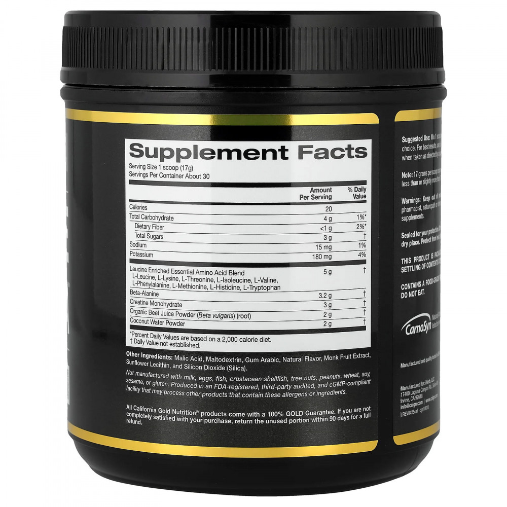 Моногидрат креатина, смесь незаменимых аминокислот, обогащённая лейцином (L-лейцин, L-лизин, L-треонин, L-изолейцин, L-валин, L-фенилаланин, L-метионин, L-гистидин, L-триптофан), бета-аланин, порошок из сока органической свёклы (Beta vulgaris) (корень), порошок из кокосовой воды.