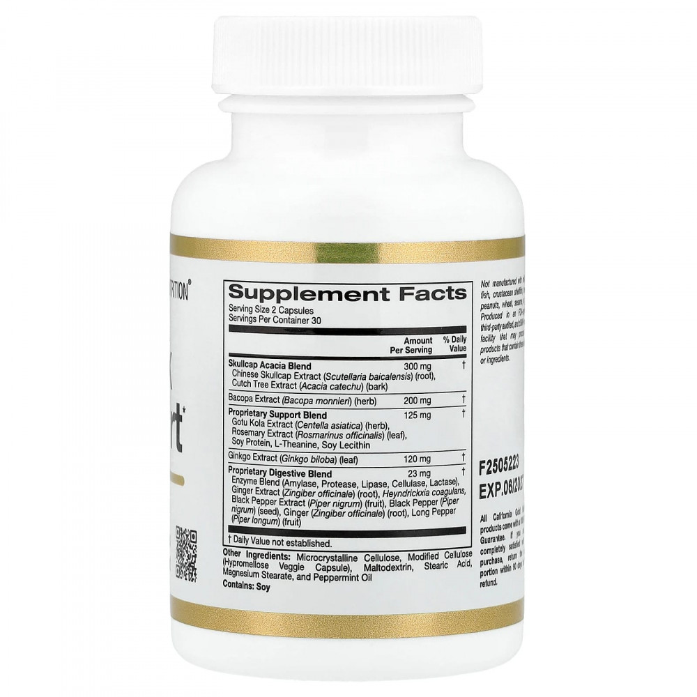 Добавка для поддержки умственной деятельности* от California Gold Nutrition® содержит клинически изученный экстракт бакопы для поддержки памяти*. Эта формула включает в себя экстракты бакопы и гинкго билоба, а также смесь шлемника и акации. Запатентованная пищеварительная смесь поддерживает процесс пищеварения*. Эта добавка содержит экстракты готу колы и розмарина, соевый лецитин и протеин, а также L-теанин, которые улучшают память и когнитивные функции*.