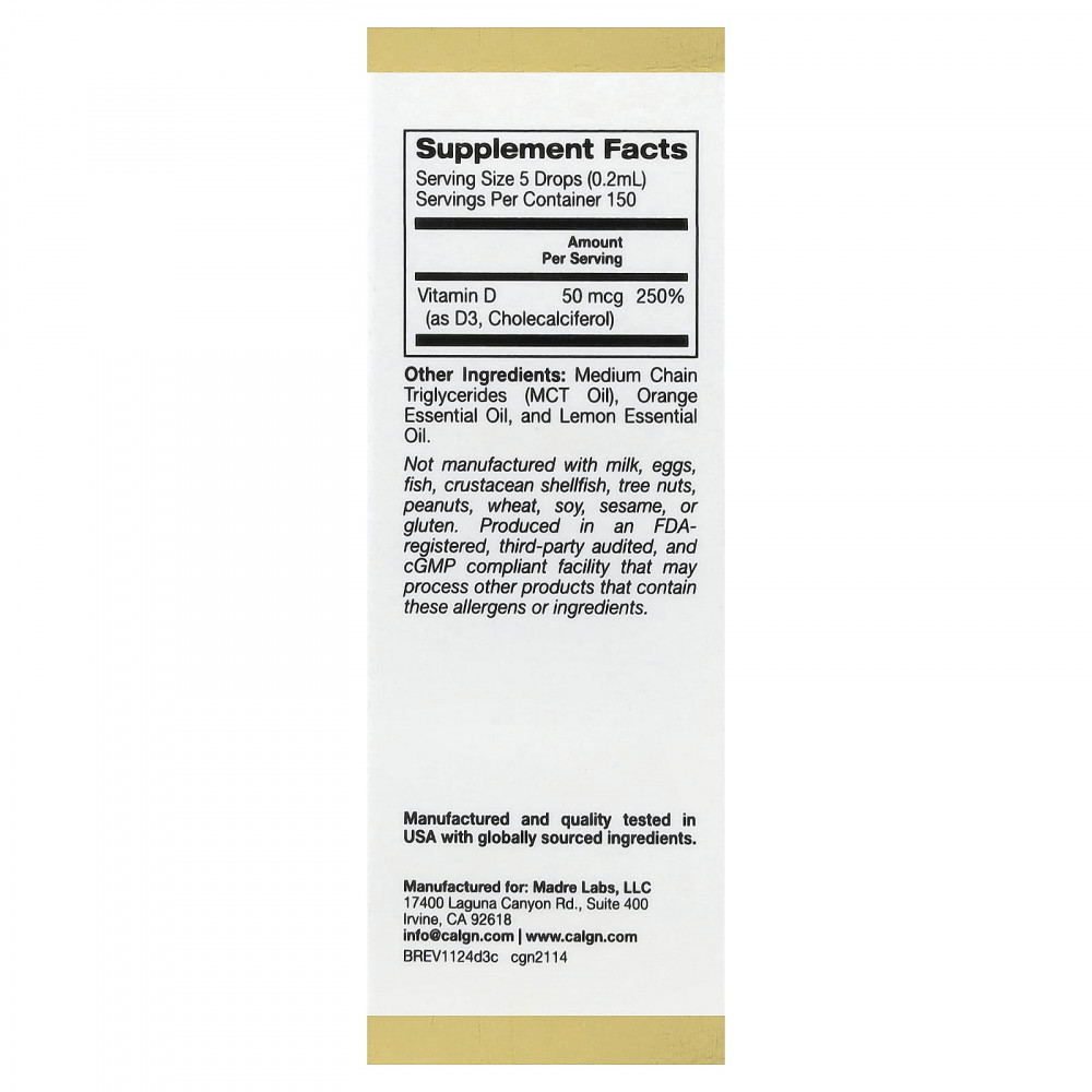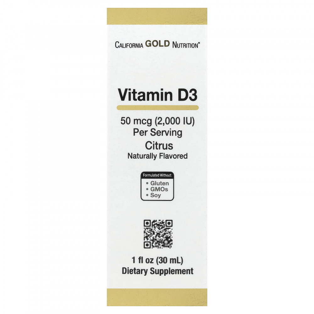 Витамин D3 от California Gold Nutrition содержит витамин D3 (холекальциферол) в виде удобной и вкусной жидкой добавки. Он имеет цитрусовый вкус благодаря эфирным маслам апельсина и лимона и не содержит глютена, ГМО и сои.