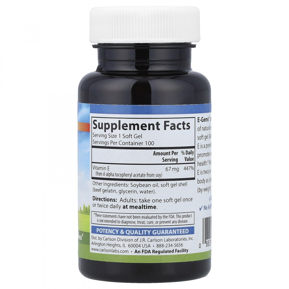 E-Gems® содержит 100 МЕ (67 мг) витамина Е из натурального источника в каждом мягком геле. Витамин Е природного происхождения является мощным антиоксидантом, который способствует здоровью сердечно-сосудистой системы. Натуральный витамин Е в нашем организме в два раза активнее синтетического витамина Е (при одинаковом весе).