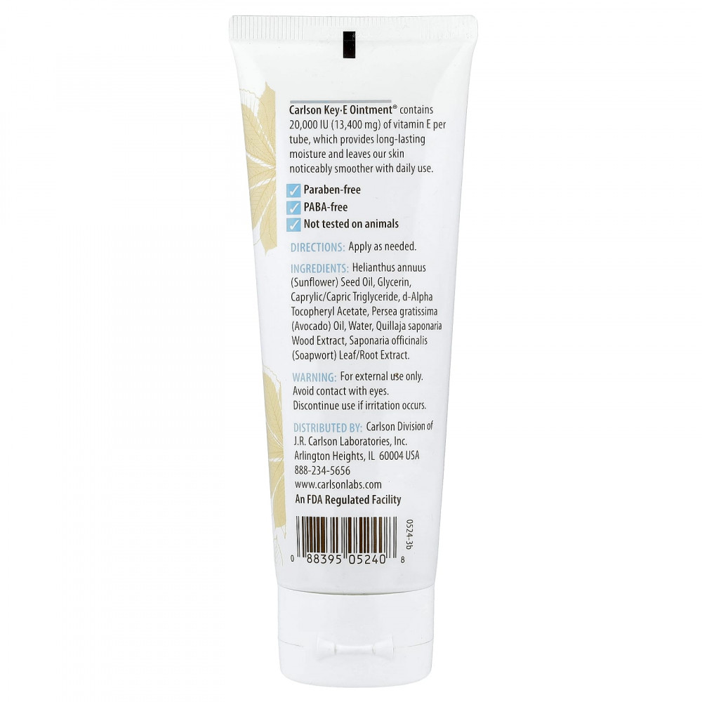 Carlson Key · E Ointment® содержит 20 000 МЕ (13 400 мг) витамина E на тюбик, который обеспечивает длительное увлажнение и делает кожу заметно более гладкой при ежедневном использовании.