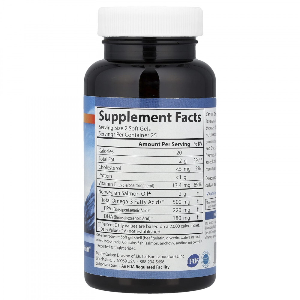 Обогащённый омега-3 жир лосося от Carlson экологичным способом получают из лосося у побережья Норвегии и другой рыбы из глубоких холодных вод, богатой омега-3. Жир лосося содержит полезные омега-3 кислоты ЭПК и ДГК и превосходит строгие стандарты тестирования на содержание ртути и других загрязняющих веществ. Свежесть, эффективность и чистота подтверждены сертификатом сторонней организации.