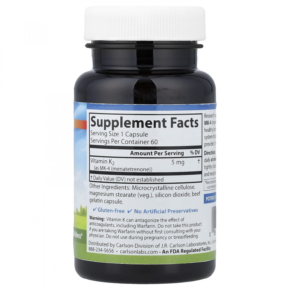Исследования показывают, что витамин K2 в виде MK-4 (менатетренон) способствует здоровью костей и работе сердечно-сосудистой системы. Одна капсула содержит 5 мг МК-4.