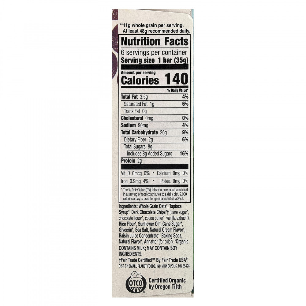 Цельнозерновая овсянка*, тапиоковый сироп*, кусочки темного шоколада*† (тростниковый сахар*, тертое какао*, какао-масло*, ванильный экстракт*), рисовая мука*, подсолнечное масло*, тростниковый сахар*, глицерин*, морская соль, натуральный ароматизатор «Сливки»*, концентрат сока из изюма*, пищевая сода, натуральный ароматизатор*, аннатто* (краситель).