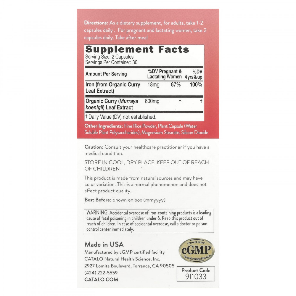 Вегетарианское железо для женщин от CATALO - это вегетарианская формула, полученная из сертифицированных органических листьев карри. Он извлекается с помощью передовых технологий, чтобы обеспечить его чистоту, биодоступность и эффективность. Женщинам может не хватать железа во время менструации, вегетарианства или частого употребления чая или кофе, что приводит к усталости и холодным рукам и ногам. Достаточное потребление железа с пищей и добавками важно для улучшения кровообращения, улучшения тонуса кожи и поддержания жизнеспособности.
