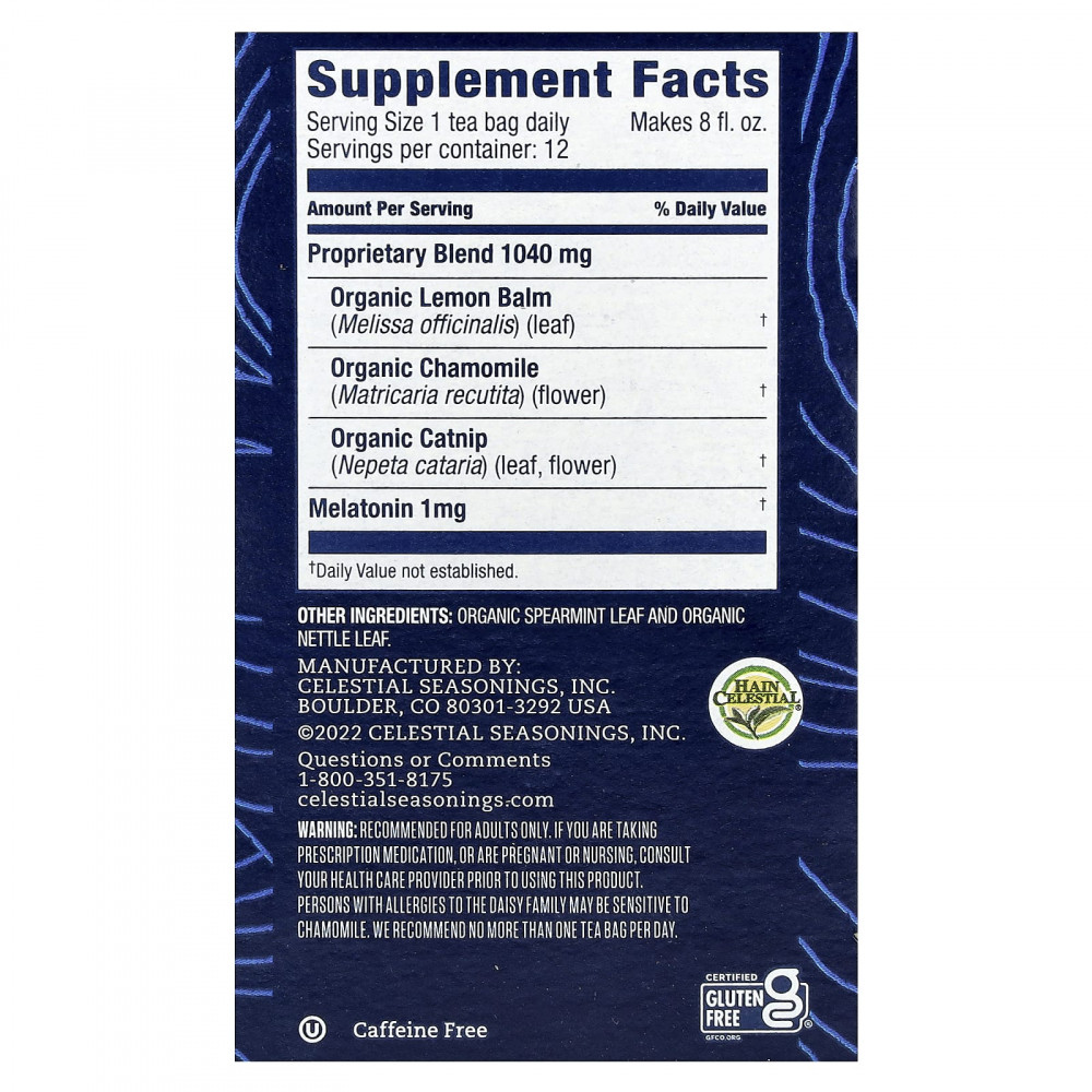 Только для взрослых. Если вы принимаете рецептурные лекарства, беременны или кормите грудью, проконсультируйтесь с врачом перед использованием этого продукта. Люди, страдающие аллергией на ромашки, могут быть чувствительны к ромашке. Мы рекомендуем не более одного чайного пакетика в день.