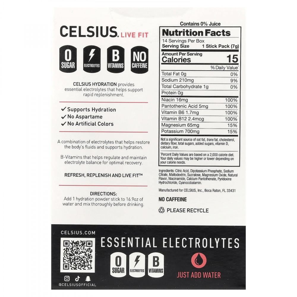 CELSIUS HYDRATION обеспечивает организм необходимыми электролитами, которые способствуют быстрому восполнению запасов.