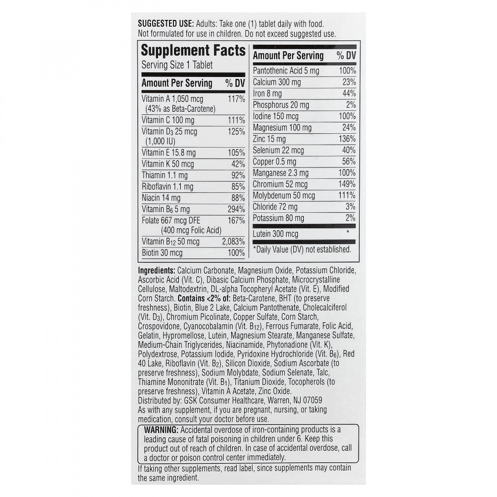 Карбонат кальция, оксид магния, хлорид калия, аскорбиновая кислота (витамин С), двузамещённый фосфат кальция, микрокристаллическая целлюлоза, мальтодекстрин, dl-альфа токоферилацетат (витамин E), модифицированный кукурузный крахмал. Содержит < 2% таких ингредиентов: бета-каротин, бутилгидрокситолуол (для сохранения свежести), биотин, краситель синий 2 лак, пантотенат кальция, холекальциферол (витамин D3), пиколинат хрома, сульфат меди, кукурузный крахмал, кросповидон, цианокобаламин (витамин B12), фумарат железа, фолиевая кислота, желатин, гипромеллоза, лютеин, стеарат магния, сульфат марганца, среднецепочечные триглицериды, никотинамид, фитонадион (витамин K), полидекстроза, йодид калия, пиридоксина гидрохлорид (витамин B6), краситель красный 40 лак, рибофлавин (витамин B2), диоксид кремния, аскорбат натрия (для сохранения свежести), молибдат натрия, селенат натрия, тальк, мононитрат тиамина (витамин B1), диоксид титана, токоферолы (для сохранения свежести), ацетат витамина A, оксид цинка.