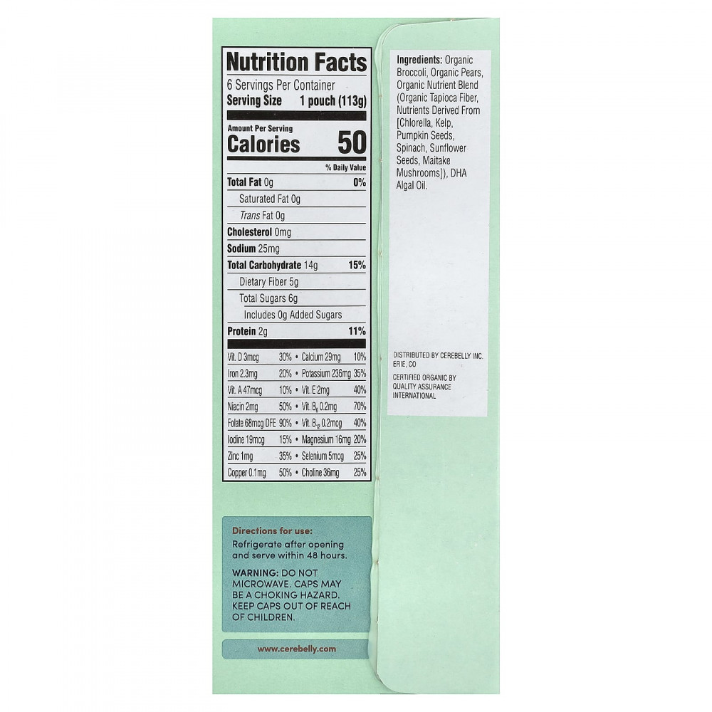 Органическая брокколи, органические груши, смесь органических питательных веществ (органическая тапиоковая клетчатка, питательные вещества, полученные из [хлореллы, морские водоросли, семена тыквы, шпинат, семена подсолнечника, гриб-баран]), масло водорослей ДГК.