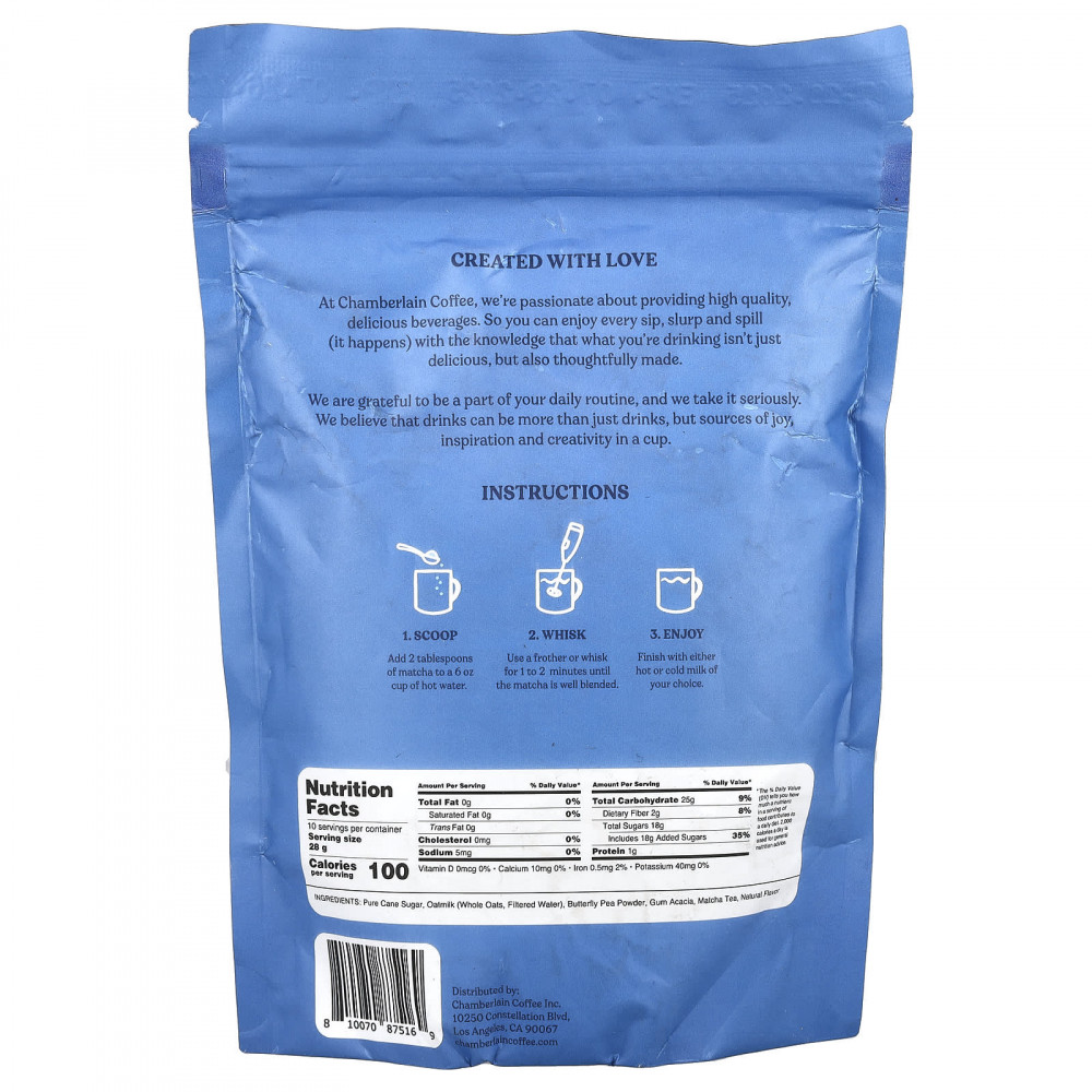 Чистый тростниковый сахар, овсяное молоко (цельный овес, фильтрованная вода), порошок из клитории, аравийская камедь, чай матча, натуральный ароматизатор.