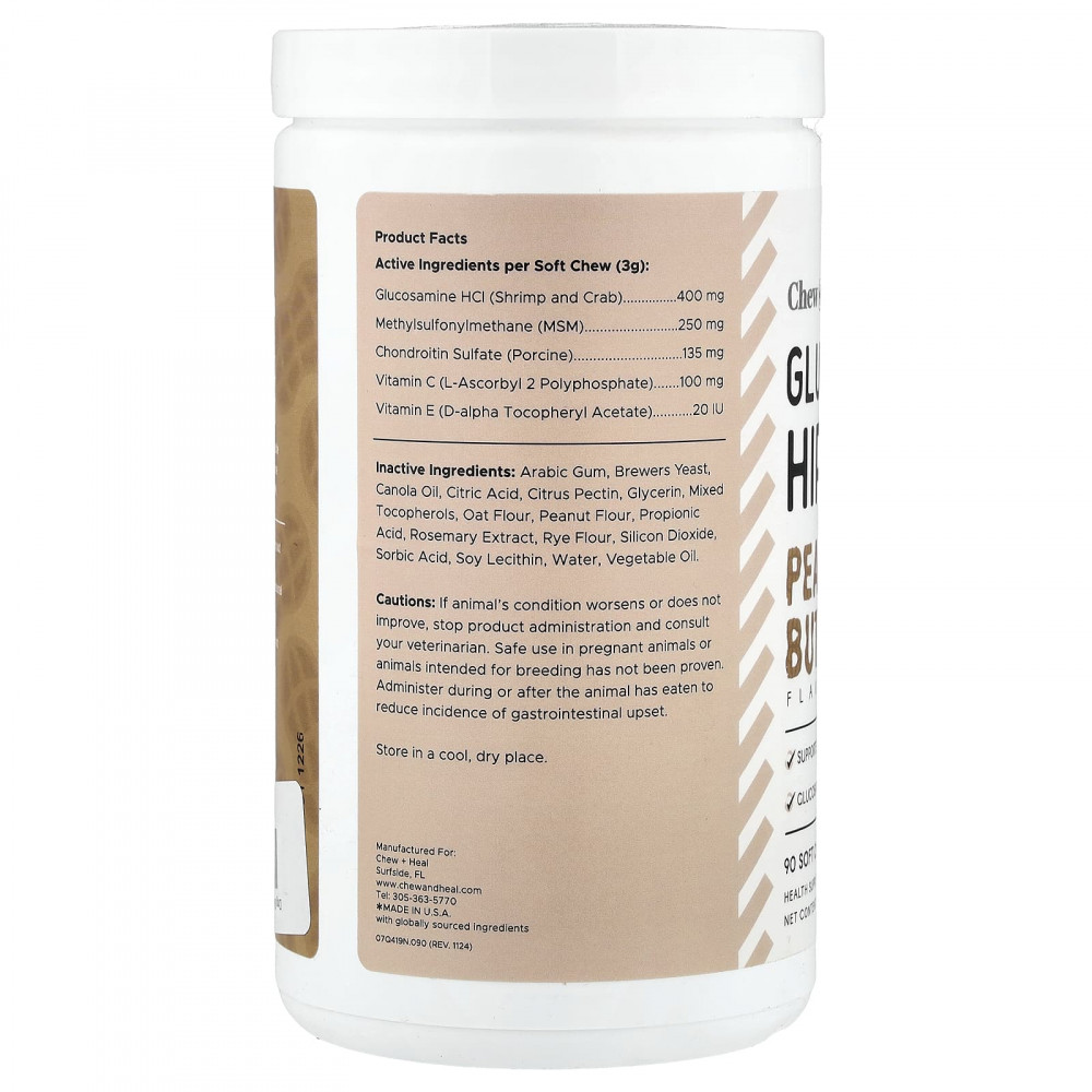 Поддержите вашего пушистого друга активным и игривым с помощью глюкозамина для бедер и суставов со вкусом арахисового масла от Chew + Heal. Эти специально разработанные жевательные таблетки содержат эффективную смесь глюкозамина, МСМ, хондроитина, витамина C и витамина E для поддержания здоровья суставов, улучшения подвижности и облегчения дискомфорта, вызванного старением или активным образом жизни. Разработанные для собак всех возрастов и размеров, они способствуют укреплению хрящей, нормальной воспалительной реакции и повышению гибкости для повседневных действий, таких как ходьба по лестничным клеткам и бег в центре. Кроме того, благодаря восхитительному вкусу арахисовой пасты ваш щенок будет считать это лакомством, а не добавкой.